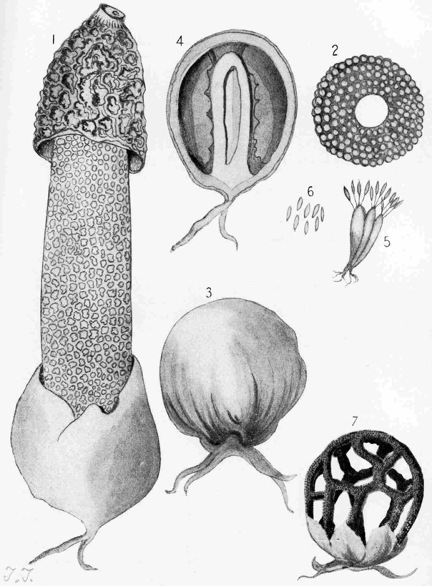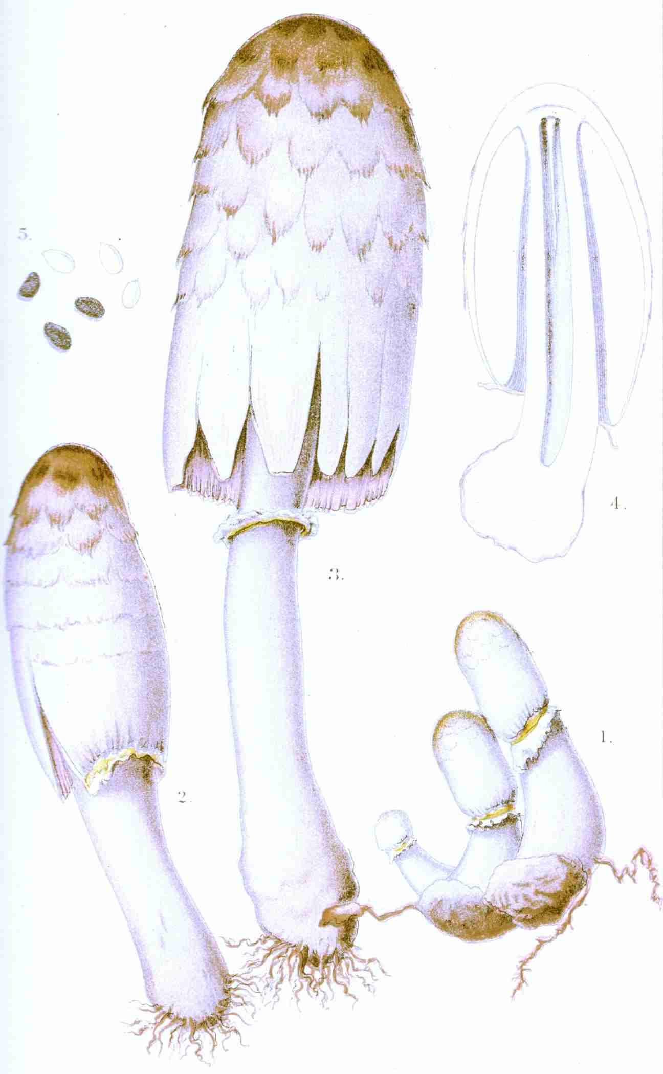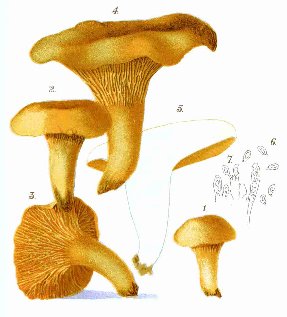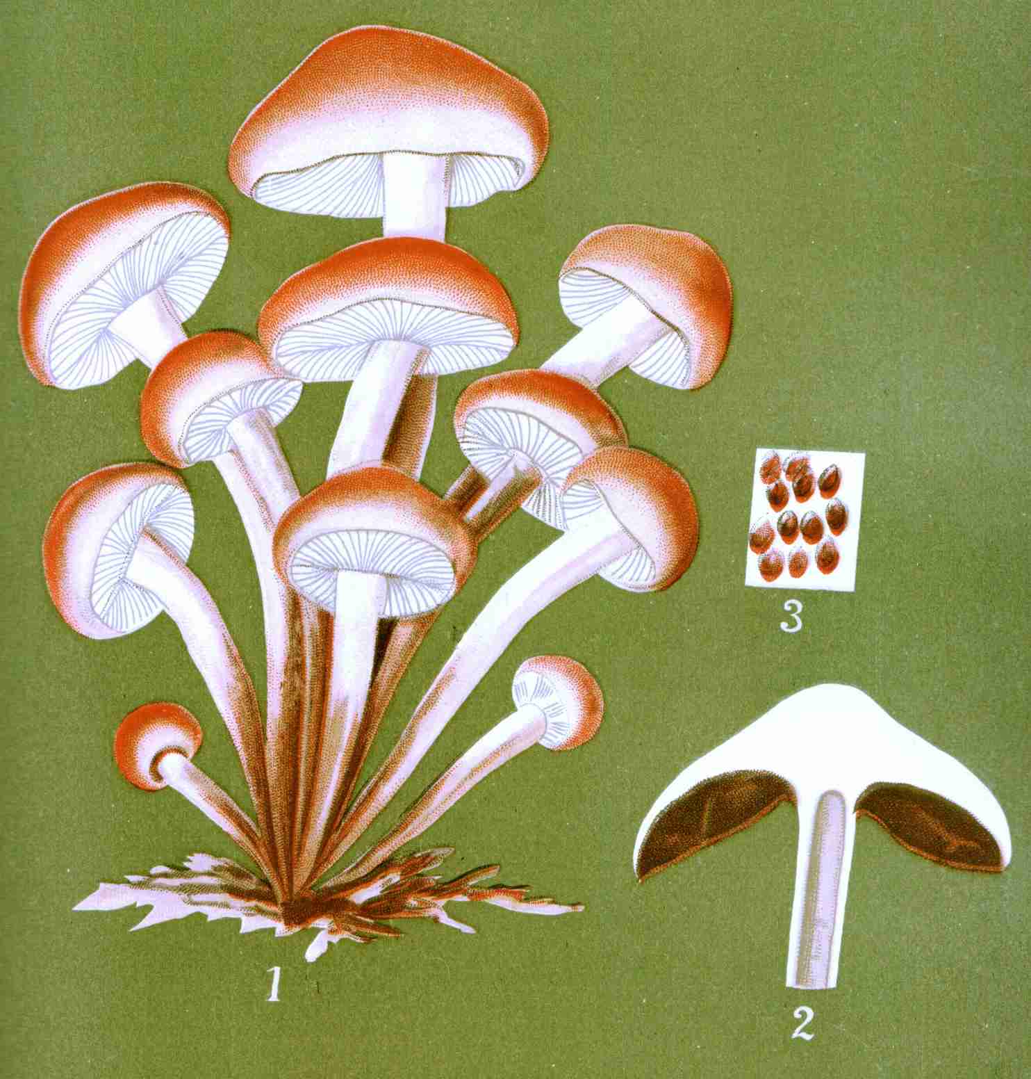 In Plate A is presented a sketch of the common field mushroom, Agaricus campester. Fig. 1 represents the mature plant; Fig. 2, a sectional view of the same; Fig. 3, the basidia, club-shaped cells from the summit of which proceed the slender tubes called sterigmata, which support the spores—highly magnified; Fig. 4, the sterigmata; Fig. 5, the mycelium, highly magnified, supporting immature mushrooms; Fig. 6, the spores as shed from an inverted mushroom cap; Fig. 7, spores magnified.