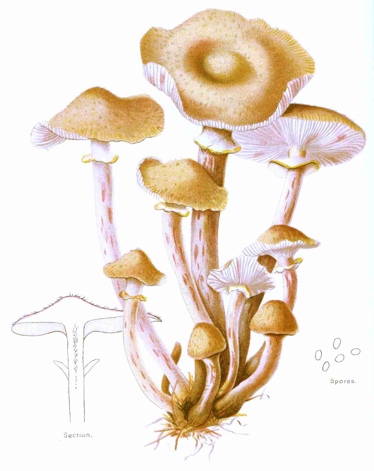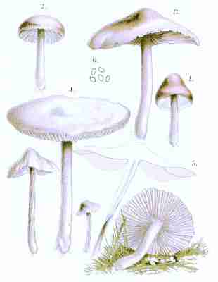 Saccardo, in 1882, commenced his Sylloge, of which not less than twelve volumes have been published. In Saccardo's system of classification the six orders of the Hymenomycetes are not essentially different in their arrangement from that of Fries, although Saccardo has raised all the subgenera of Agaricus to the rank of genera, and then altered their sequence so as to bring them into four sections, distinguished by the color of their spores. Having raised the old subgenera of Fries to generic rank, Saccardo found it necessary to limit the application of [Pg 1-8]the term Agaricus to the group of fungi to which it was originally applied by Linnæus, viz., the common field mushroom Agaricus campester, and its allies, represented by Agaricus arvensis, Agaricus Rodmani, etc., or, as Prof. Peck more definitely states it, "to those of the gilled mushrooms which have brown spores, free gills, a stem bearing a ring, gills generally pink-colored in the early stage, and brownish black when fully matured." M. C. Cooke, the distinguished English mycologist, prefers to retain the genus Agaricus with its original subgenera intact, succeeded by the other genera of Agaricini, as in the Hymenomycetes Europei of Fries, giving as his reason the belief "that for purposes of classification features should be taken which are present and evident in the specimens themselves, and are not dependent on any of their life-history which cannot be presented in the herbarium."