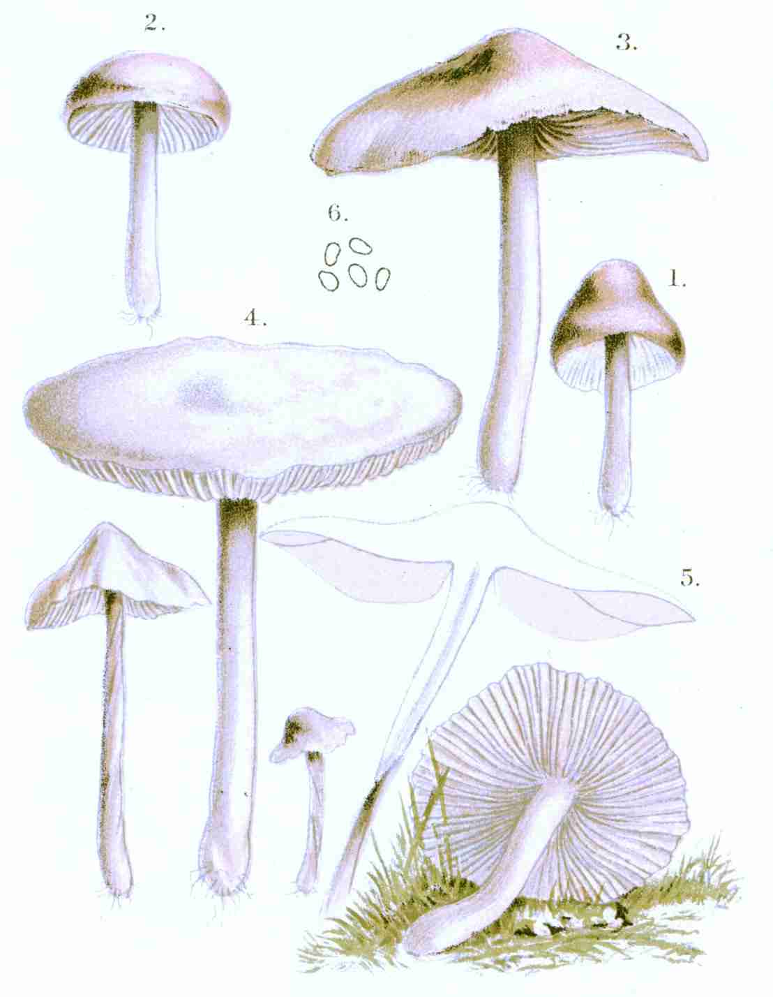 Hogg & Johnson, 5 groups: Leucosporei, white; Hyporhodii, salmon; Dermini, rusty; Pratellæ, purplish-brown; Coprinarii, black.