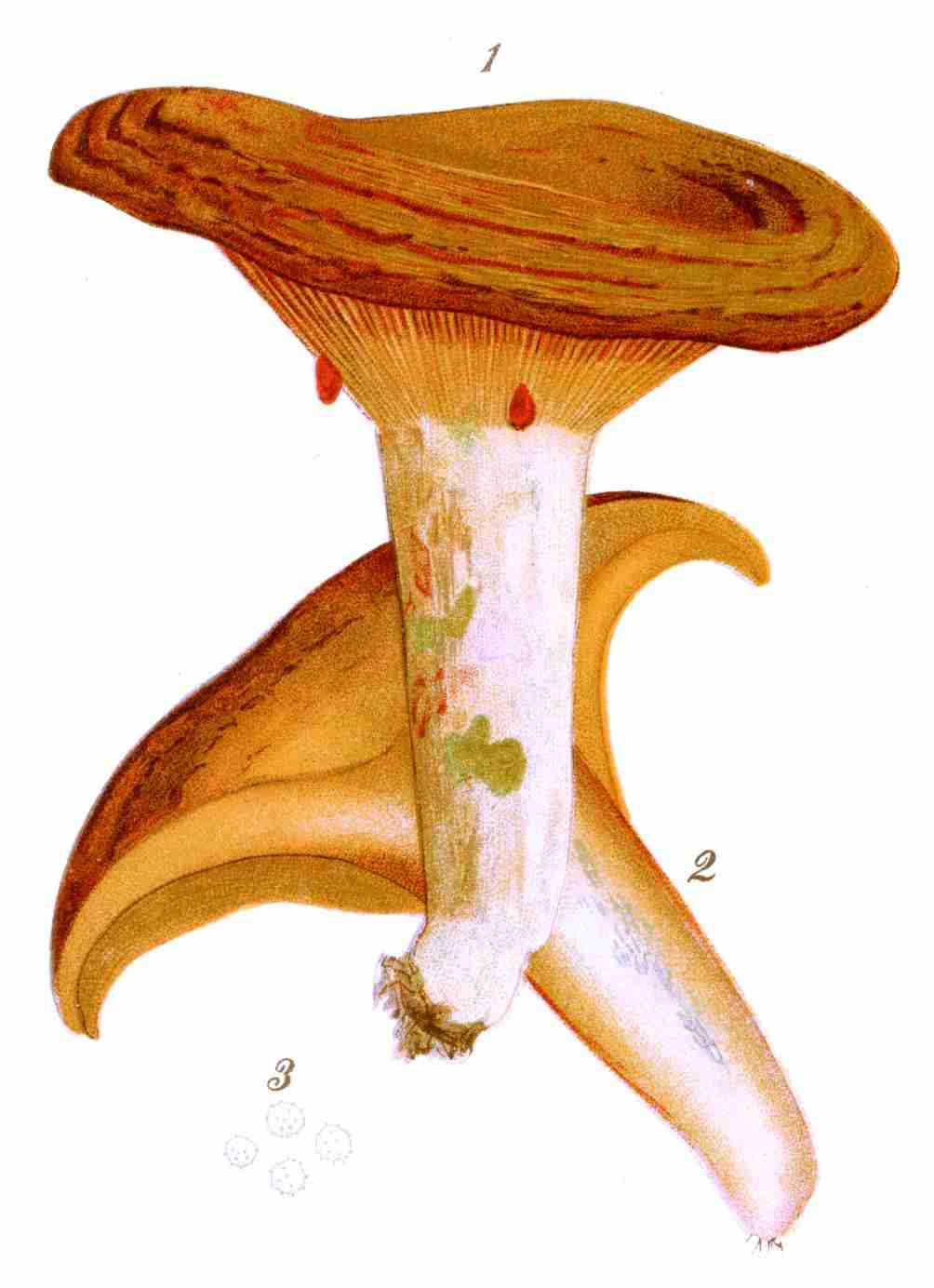 Mushroom gills, or lamellæ, anatomically considered, are composed, first, of a central portion, a prolongation of the hymenophore or flesh of the cap, more or less dense, sometimes so thin as to be scarcely perceptible; second, the hymenium or spore-bearing membrane covering the surfaces of this prolonged hymenophore. They are vertical, simple, equal, respectively, or more frequently alternating with shorter gills. They are often evanescent and putrescent, sometimes liquefying altogether. Their color is usually different from the upper surface of the cap, not always similar to that of the spores borne upon them, at least in youth; with age, however, they usually assume the color of the mature spore. The change of color of the gills according to the age of the plant is very important in the study of the Agaricini; it accounts for the white gills of certain species in youth, the pink in maturity, and the brown when aged.