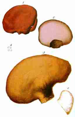 In the Polyporei, pore-bearing mushrooms, the gills are replaced by tubes or pores. The tubes are little cylinders, long or short, pressed one against another, forming by their union a layer on the under surface of the cap, and the sporiferous membrane or hymenium lines their inner walls. Their upper end is always closed, while the lower extremity is open to permit the outward passage of the spores. The tubes are generally joined together and are not easily disunited. They are free, i. e., separable, in the sole genus Fistulina. As regards their attachment to the cap, the tubes may be firmly adherent as in the genus Polyporus or easily detached in a single mass as in Boletus, the fleshy form of the order Polyporei. They frequently leave a circular space of greater or less dimensions around the stem, or they adhere to or are prolonged upon it in such a manner that the orifices rise in tiers one above another. The color of the tubes, although not offering as characteristic varieties as that of the gills, changes nevertheless according to species and according to the age of the plant. The tubes may sometimes be of a different color from their orifices, as in Boletus luridus. In some of the Boleti the color of the flesh is changed on exposure to the air and the tubes often assume the same tints. The tubes, generally called pores, are sometimes closely adherent to the substance of the cap, which is often hard, corky, or coriaceous, as seen in most of the Polyporei.
