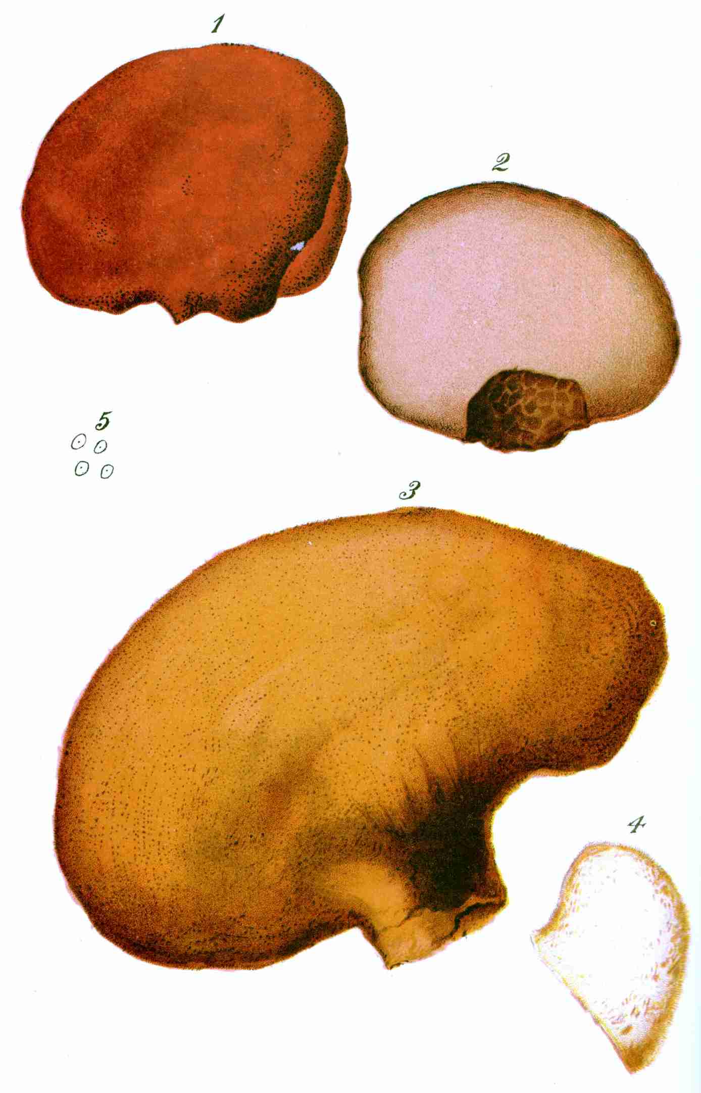 Mushroom spores are very variable in size, shape, and color, but are generally constant at maturity in the same genus. Their shape, almost always spherical in the young plant, becomes ovate, ellipsoidal, fusiform, reniform, smooth, stellate, sometimes tuberculate, or remains globose. This feature, varying thus with the age of the plant, should be studied in the mature plant.