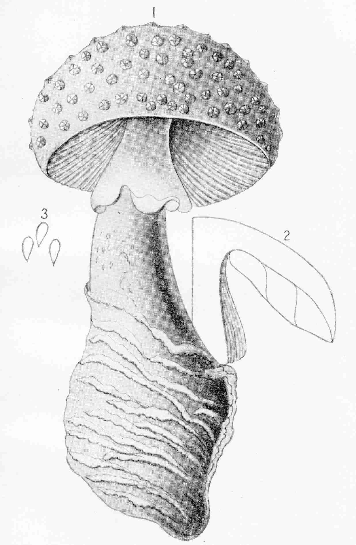 The volva is a membrane which envelops the entire plant in embryo, giving it the appearance of an egg. It originates at the base of the mushroom and furnishes it, during its fœtal life, with the means of support and nourishment. Its texture is so delicate that it generally disappears, leaving very little trace of its existence on the adult plant. In many of the volvate species this organ exists only so long as they are under ground, and some mycologists restrict the term "volvati" to such only as retain it afterwards. As the young plant expands it breaks through the top of this volva or wrapper, and, emerging, carries with it patches of the membrane on the upper surface of the cap. These are more or less prominent, numerous, and thick, sometimes irregularly disposed, sometimes regularly in the form of plates, warts, etc. At the base of the stem of the mushroom the remains of the volva are seen in the form of a sort of wrapper. This is more or less ample, thick, and ascending. It is called free when it is loose or easily detached from the stem, and congenital when it cannot be separated from it without laceration. In some species it is distinctly membranous, and in others floccose, and friable in character, sometimes appearing in ridges as a mere border, at others broken up into scales, and, as the plant matures, wholly disappearing. The volva is a feature of great importance in the study of the Agaricini, of the subgenera Amanita, Volvaria, etc.