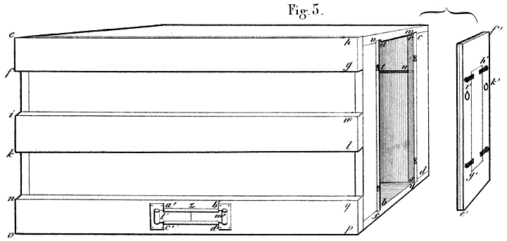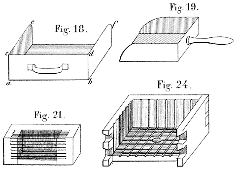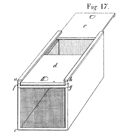 Een der eerste werken, die mij in de handen kwamen, was: “Nieuwe leerwijze omtrent de bijen en derzelver zoogenaamde magazijnenteelt, door Rijkend Jakob Brouwer, 1809.” Naar aanleiding hiervan, liet ik mij magazijnkastjes [3]maken, welke mij in het gebruik echter niet best bevielen. De leerwijze van voornoemd werk beviel mij evenmin, als die uit de drie bekroonde verhandelingen over de bijenteelt, uitgegeven door de maatschappij ter bevordering van den landbouw te Amsterdam.