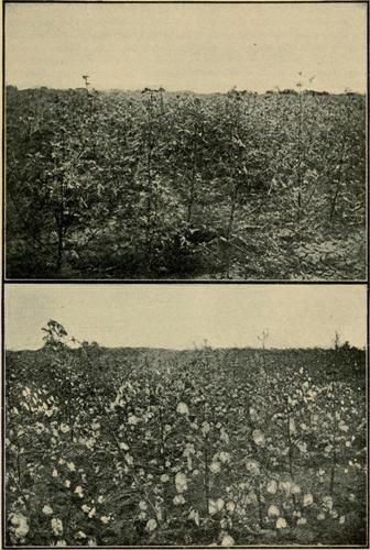 The upper illustration shows a cotton field planted late and yielding nothing.