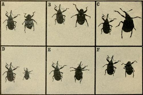 At left of each pair is a boll weevil.