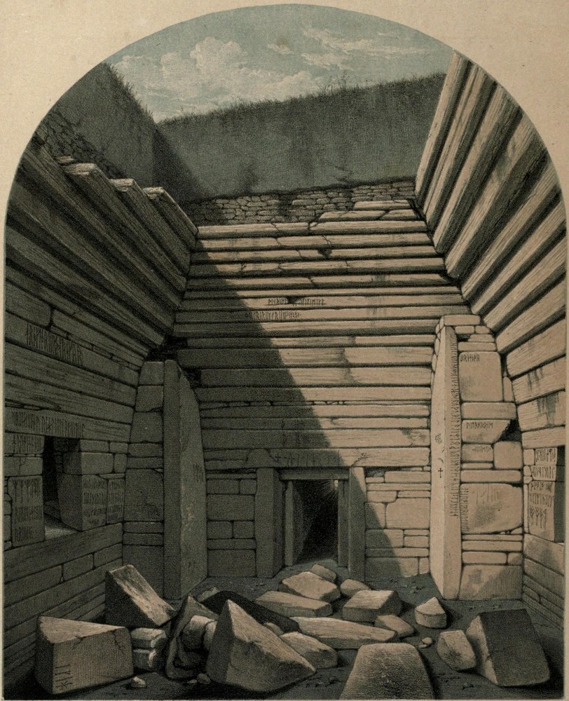 After a few days’ labour the whole of the rubbish filling the chamber was removed, but long ere this was accomplished, the keen eye of Mr. Joseph Robertson discovered the first of the Runic inscriptions. They were high up on the walls of the building, smaller and less distinctly drawn than many that were afterwards discovered, but the important fact of the existence of Runic inscriptions in Orkney, where none had hitherto been found, was at once established.