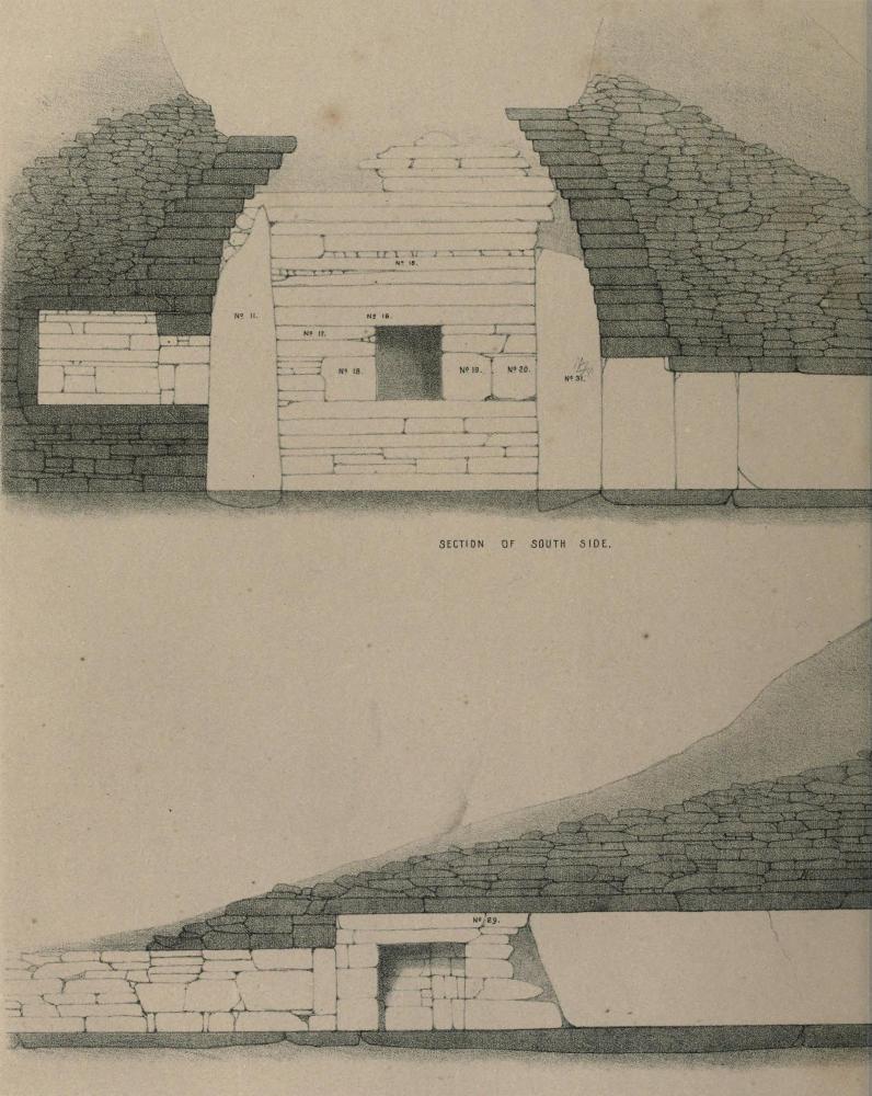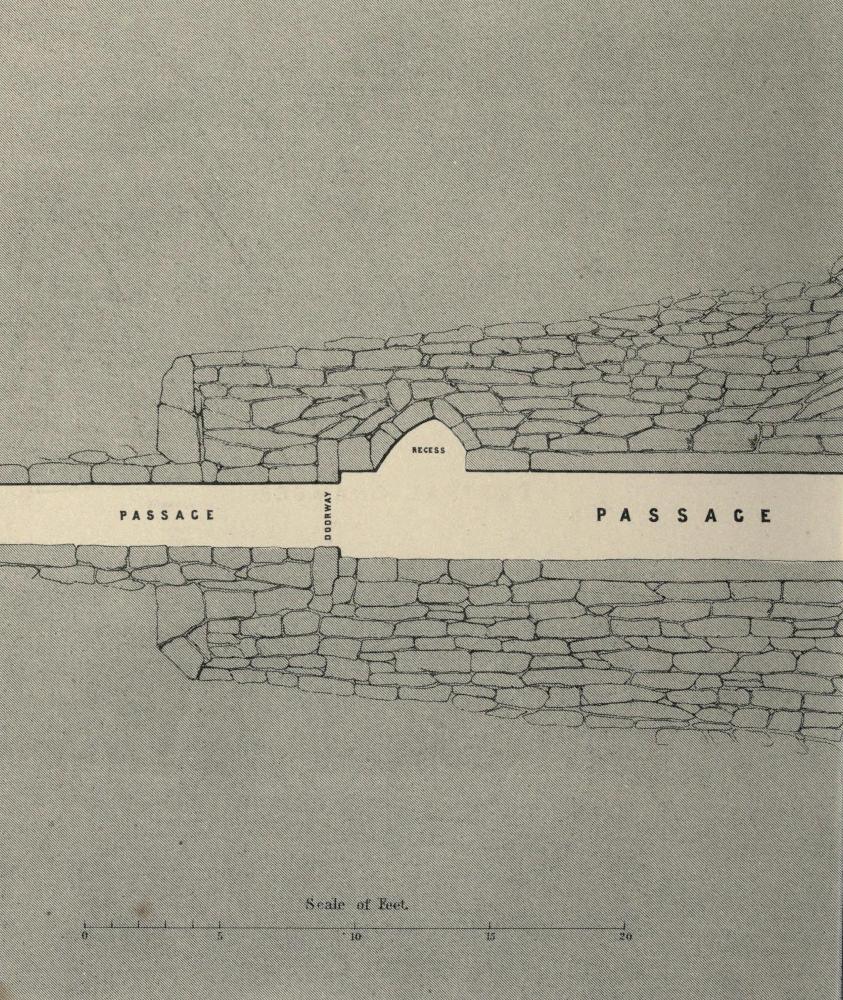 The passage leading to the central chamber is 2 feet 4 inches wide at its mouth, and appears to have been the same in height, but the covering stones had been removed, or had fallen in for about 22½ feet. The passage then increases in dimensions to 3¼ feet in width, and 4 feet 4 inches in height, and continues for 26 feet, when it is again narrowed by two upright stone slabs to 2 feet 5 inches. These slabs are each 2 feet 4 inches broad, and immediately beyond them the passage extends 2 feet 10 inches, and then opens into the central chamber. Its dimensions from the slabs to its opening into the chamber are 3 feet 4 inches wide, and 4 feet 8 inches high. At the commencement of the passage there is a triangular recess in the wall about 2 feet deep, and 3½ in height and width, in front and opposite to it in the passage, a stone of corresponding shape and dimensions, suggesting the idea that it might have been used to close the passage, and that it was pushed back into the recess in the wall when admission into the chamber was desired. From this recess to the chamber, the sides of the passage, the floor and roof, are formed by four immense slabs of flagstone; three of these stones are broken, and the fourth slightly cracked.