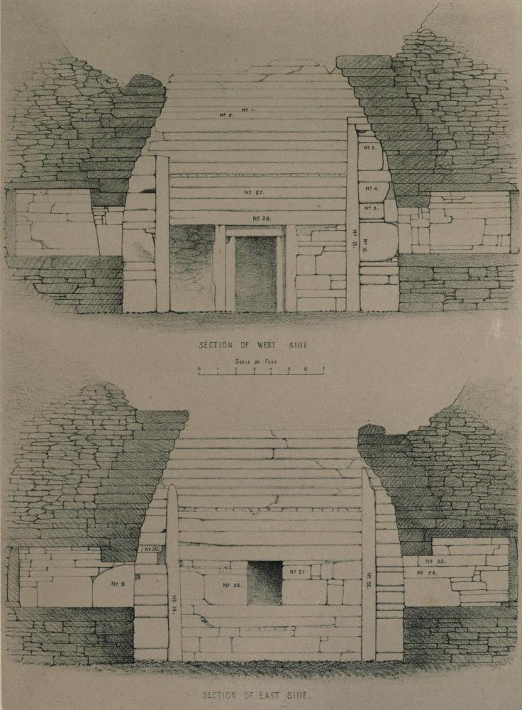 [Pg 15]The chamber when cleared out proved to be about 15 feet square on the level of the floor, and 13 feet in height, to the top of the present walls. Immediately opposite to the passage is an opening in the wall 3 feet from the floor. This is the entrance to a cell or small chamber in the wall, 5 feet 8 inches long, 4½ feet wide, and 3½ high. A large flagstone is laid as a raised floor between the entrance and the inner end of the chamber. The entrance is 2 feet wide, 2½ high, and 22½ inches long. On the two opposite walls of the chamber are similar openings in the walls. The one on the right is 2½ feet wide, 2 feet 9 inches high, and 1 foot 8 inches long. It gives admission to a cell 6 feet 10 inches long, 4 feet 7 inches wide, 3½ feet high, and has a raised flagstone floor, as in the other chamber. The opening on the left is 2¼ feet wide, 2½ high, and 1¾ long, and about 3 feet above the floor of the chamber. The cell of which this is the entrance is 5 feet 7 inches long, 4 feet 8 inches wide, and 3 feet 4 inches high. It has no raised floor like the two other cells. The roofs, floors, and back walls of the cells are each formed by a single slab of stone, and stones corresponding in size and shape to the openings in the walls were found on the floor in front of them. The natural inference is that they were originally the seals of the chambers in which the honoured dead reposed.