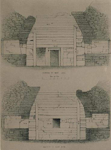 Large quantities of earth had been piled up over the building when [Pg 16]completed. In each angle of the central chamber stands a large buttress, doubtless intended to strengthen the walls, and support them under the pressure of their own weight, and that of the mass of earth with which the whole was covered. These buttresses vary somewhat in dimensions, but they are on an average about 3 feet square at the base, and from 9 to 10 feet high, with the exception of one which is only 8 feet high. In each buttress one side is formed by a single slab. The walls of the chamber are built with large stones, which generally extend the whole length of the wall. No lime or mortar of any kind has been used.