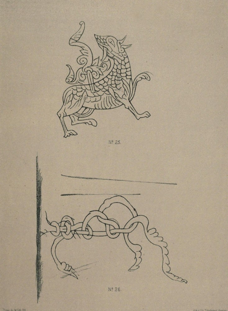 The entire number of Runic characters may be about 935, exclusive of scribbles and many doubtful marks. The monograms and bind-runes, or connected consonants, are considered as forming one letter. There are also some marks which may have been intended to represent a horse and an otter with a fish in its mouth; also, a winged dragon and a worm knot, which last has much the appearance of one of the great Saurians. The two hind legs are very plainly defined.