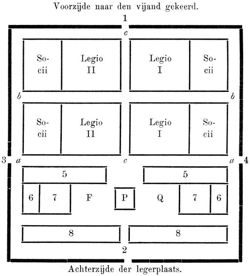 Acies, Τάξις, slagorde, opstelling van het leger voor den slag. 1) Bij de Grieken, zie Τάξις.—2) Bij de Romeinen moet men voor de opstelling drie perioden onderscheiden; voor de oudste periode tot op den tijd van Camillus zie men Centuria. Het leger werd toen in ééne aaneengeschakelde (grieksche) phalanx opgesteld, waarvan de kern gevormd werd door de zwaargewapende burgers van de drie eerste klassen der serviaansche indeeling; achter hen waren de lichtgewapenden opgesteld, terwijl de ruiterij op de flanken stond. Deze slagorde was in de gevechten met de Galliërs ondoelmatig gebleken, en vervangen door een indeeling in manipels, waarvan de artikelen centuria, cohors, hastati en legio een voorstelling geven. Elk legioen werd in drie liniën in slagorde geschaard; vooraan stonden de manipels der hastati, dan die der principes, eindelijk die der triarii. Tusschen de verschillende manipels werd eenige ruimte gelaten, zoodat ieder manipel op zichzelf een geheel vormde, terwijl zij zich zoo noodig elk oogenblik konden aaneensluiten; hierdoor kreeg het leger een groote gemakkelijkheid van beweging. In den slag stonden meestal de beide legioenen in het centrum, de socii en de ruiters op de flanken. Oudtijds stond het leger in ééne lange lijn (fronte longa). Later vindt men o.a. de acies obliqua, waarbij een deel van het leger aanvalt en het andere voorloopig buiten gevecht blijft, de acies sinuata, wanneer de vleugels den aanval beginnen en het centrum achterblijft; zie ook cuneus en forceps. De oorlogen met de Cimbren en Teutonen gaven Marius aanleiding, deze indeeling te vervangen door eene in cohorten, waarbij telkens één manipel der hastati, principes en triarii tot eene cohors van 600 man vereenigd werd; tien cohorten vormden eene legio; zie verder cohors. De Romeinsche ruiterij werd nu afgeschaft; zij komt het laatst voor in den oorlog tegen Jugurtha.—Onder Caesar telde het legioen 3000 à 3600 man, ingedeeld in 10 cohorten van 3 manipels, ieder van twee centuriae. Gewoonlijk was de slagorde de [6]acies triplex. Vier cohorten van ieder legioen vormden de prima acies, drie de secunda acies, en drie de tertia acies. Vóór Camillus is dus de taktische eenheid de centuria, in den tijd van Polybius de manipulus, na Marius de cohors.