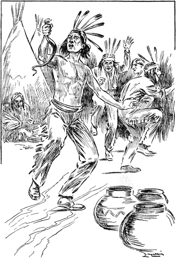 There was no answering this sort of logic, and the boys strolled out to the porch to see if they could sight any trace of Harry Harkness. There was no sign of him, however, and after a prolonged period of gazing across the blazing desert, the boys sank back in three of the big rockers that stood in a row on the porch. It was dull, sitting there in the intense heat and drowsy silence, broken only at long intervals by the clatter of a pony's hoofs as some cow-puncher ambled by at an easy lope. A loud snore from Tubby soon [Pg 20]proclaimed that he was off, and Merritt and Rob were about to follow him into the land of dreams, when there came a sudden interruption.