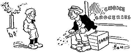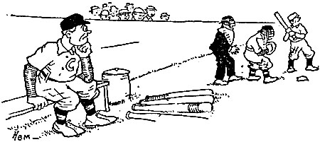 | He came here in the early Spring with all the tryout mob, Striving to bat like Wagner and to slide (spikes first) like Cobb. Some of the vets cried, “Bonehead!” Others remarked, “Poor zob!” Modest as Spring’s arbutus, calm as an April dawn, He asked for no advances though his ticker was in pawn; He learned the law from Jawn McGraw but never called him “Jawn.” He graced the bench until July, leading the simple life— He wouldn’t touch a cocktail once to please a schoolmate’s wife; The slightest hint of a “creme de mint” would cut him like a knife. The village smith that stood beneath the spreading chestnut tree Had nothing on this youngster in the dodging of a spree. Others could tipple if they would—not for Recruit McGee. [Pg 14] Thus did the minor leaguer seek for affluence and fame— Virtue’s its own reward at times, but oft it pulls up lame. Now he has went back to the place from which he once had came! |