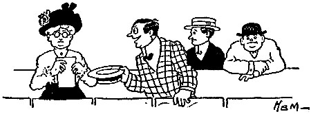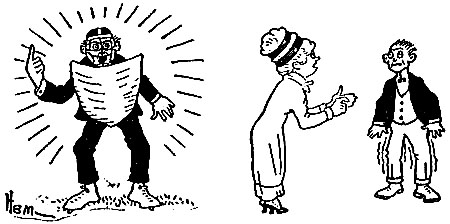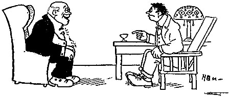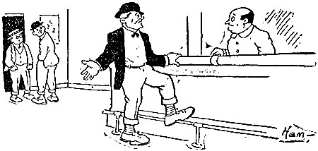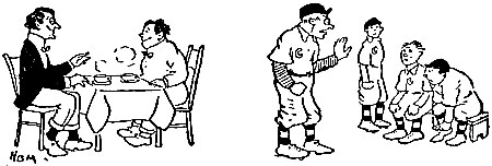 | The cricket game was over and the sun was sinking low, The players in their blazers plodded homeward in a row. They stopped within the clubhouse for a final cup of tea, When up spake Captain Edgerton to Bowler Basil Fee: “Jolly well tried, old chap! You lost as the greatest can; But whether you win or whether you lose You’re always a gentleman. Have a Scotch and soda, old fellow— It will drive off the blooming blues; Keep up your stride, you jolly well tried, And a man can’t always lose.” The baseball game was over and the home team had been skinned, [Pg 32]The players slunk across the field while sundry knockers grinned; They hurried to the clubhouse for a bath and change of garb, When up spake Manager McDuff, and each word was a barb: “Fine lot of high-priced athletes! Most of you ain’t alive! I could pick a team from the Soldiers’ Home And beat you four out of five. Be out here at ten to-morrow— That goes the way that it lays; Any mixed-ale sport that doesn’t report Will squat on the bench ten days!” |