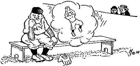 | Baseball, they say, has changed a heap; I guess it has, in spots, And yet I liked it better when we played it on the lots. There were no signs for “hit and run,” no dazzling “fadeaways”; We had no high-priced managers to tell us fancy plays. No, we were just a lot of kids, with tanned and freckled hides; There were no concrete grand stands when we played at “choosing sides.” I saw a ball game yesterday, and o’er a brass band’s blare The cheers of thirty thousand fans were soaring through the air. [Pg 44]The turnstiles had been clicking for three solid golden hours, Recording wealth and profit for the big league baseball powers. How soon we lose our play days! How swiftly childhood glides! There were no clicking turnstiles when we played at “choosing sides.” The captains used to toss a bat, and then, hand over hand— But why repeat a story every boy must understand? Then came the careful picking—“I’ll take Reddy.” “Give me Flynn.” “I’ll choose you, Skinny Murphy.” “I’ll take you, Pat McGinn.” They picked the live ones first, of course, and finished with the snides; Feelings were often ruffled when we played at “choosing sides.” Dear reader, you’ll remember, if you peek into the past, The little four-eyed fellow that was always chosen last. The little weak-kneed urchin that the captain would ignore Until he found by counting, that he needed one man more. He couldn’t bat, he couldn’t field, and yet that shrimp to-day Is making laws in Congress, while his captain drives a dray. |