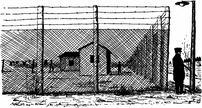 The barracks of the Crefeld Hussars, now wired in and used as a prison camp, are large and strongly built. The prisoners occupied three large buildings and a fourth smaller one provided mess rooms and canteen, etc.