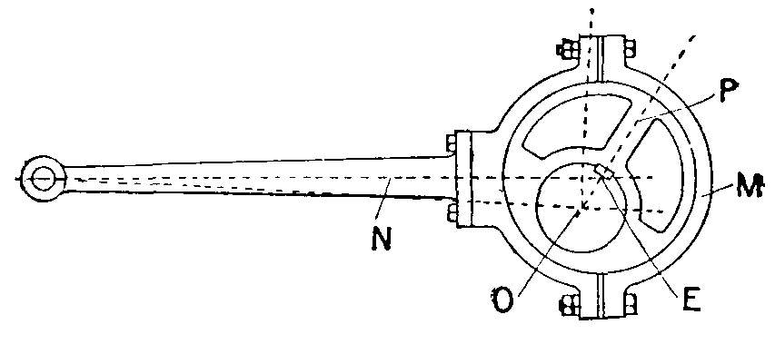 P, Pulley. M, Strap. N, Rod. O, Centre of shaft. E, Centre of eccentric. O, E, Is the throw or radius of the eccentric.