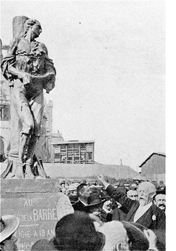 Cette statue s'élèvera en face de la basilique du Sacré-Coeur, à Montmartre. C'est là qu'a eu lieu, dimanche dernier, la manifestation dont nous reproduisons un épisode. Notre instantané fut pris au moment où, devant le monument du sculpteur Bloch, représentant La Barre les jambes brisées par le supplice des coins, la figure contractée de douleur et se soutenant à peine, M. Le Grandais, conseiller municipal, prononçait le discours le plus véhément de cette journée, où l'on en a cependant entendu de violents.