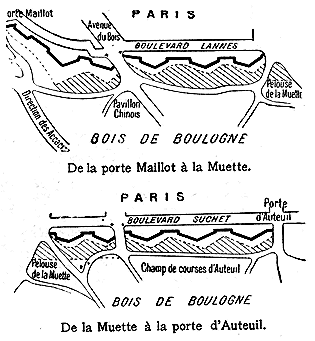 ![]() De la Muette à la porte d'Auteuil. La section grisée en traits obliques indique la bande boisée que l'administration se propose de lotir.--Croquis communiqués par «le Figaro». |