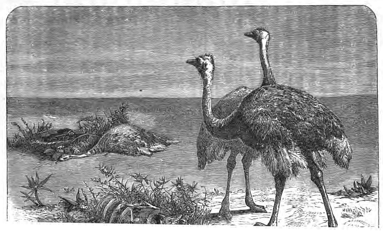 Ostrich eggs also furnish the Bushman with many a meal; and the huge shells of these eggs serve him for water-vessels, cups, and dishes. He is exceedingly expert in tracking up the ostrich, and discovering its nest. Sometimes he finds a nest in the absence of the birds; and in a case of this kind he pursues a course of conduct that is peculiarly Bushman. Having removed all the eggs to a distance, and concealed them under some bush, he returns to the nest and ensconces himself in it. His diminutive body, when close squatted, cannot be perceived from a distance, especially when there are a few bushes around the nest, as there usually are. Thus concealed he awaits the return of the birds, holding his bow and poisoned arrows ready to salute them as soon as they come within range. By this ruse he is almost certain of killing either the cock or hen, and not infrequently both—when they do not return together.