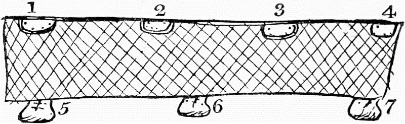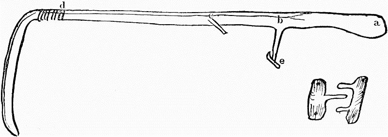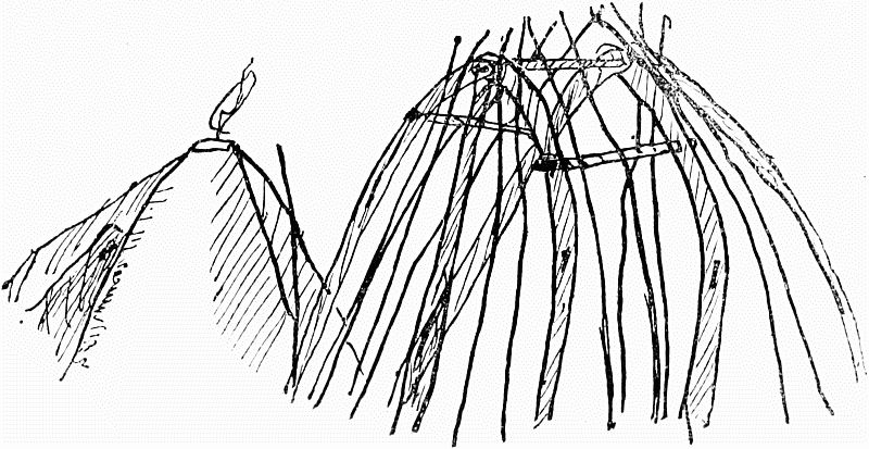 The first figure represents two connected[Pg 8] beams, which compose the frame-work of one side of the hut; and these meet at the[Pg 9] top with two similar ones, forming the opposite side. A solitary beam is placed on each side, in the middle of the arch formed by these four, so that the whole edifice has six angles. Two more slender sticks, but equally tall, are then erected between every two angles, or main ribs, of the building. Over the whole is spread the covering of the tent (made of walmal cloth). The usual height of the structure is about a fathom and half, and the breadth two fathoms. A flap of cloth is left, so as to open and shut by way of a door, between two of the main beams.