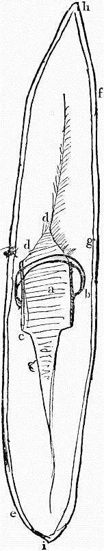 The annexed figure is a sort of plan of the floor of one of these Lapland tents. a is the fire-place. b, b, reindeer skins, six in number, three at the right hand, on entering the tent, and as many at the left. c large fire-wood. d cheese-vessels. e kettle, with its lid. f, behind the first reindeer skin, is the place of the harness. g a barrel or cask. h a store of skins and hair of the reindeer. i the milk-strainer, with its flat cover.[Pg 15]