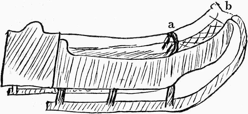 The Laplanders use a curious kind of box or basket, which they call kisa, for keeping or carrying various articles. It is of an oval form, with the bottom and sides[Pg 24] made of fir, like a box, being about a foot and half long, a foot broad, and six inches deep, with a transverse opening in the bottom to admit a part of the saddle of the reindeer. The contents are confined by a lacing of cords, that goes from side to side across the top, which is otherwise open. Two such boxes, each weighing about two pounds, are placed like panniers upon the reindeer; for that animal cannot carry above four or five pounds weight, and the castrated males only are used as beasts of burthen at all. A leather thong crosses the saddle, connected with another longer one, which goes round the chest of the animal at one part, and round its thighs, like the breechings of a horse, at the other. A pack-saddle, made either of reindeer skin, or of walmal cloth, with a bow of spruce fir, goes across the back, and is connected with the leather thongs just mentioned, being further secured by a girth under the belly. Against the sides of this pack-saddle the above-described boxes or[Pg 25] baskets are hung and fastened, the transverse chink in the bottom of each being fitted to the saddle.