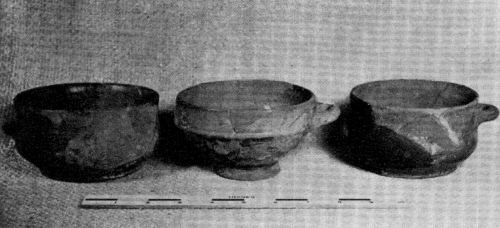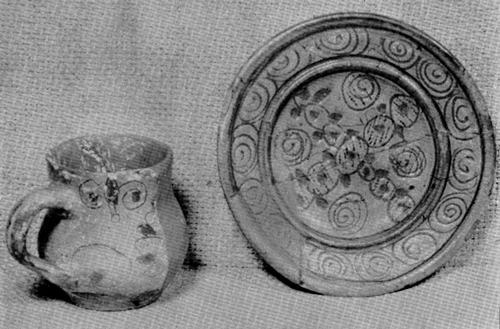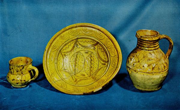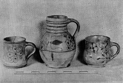 Figure 1.—North Devon sgraffito cup, deep dish, and jug restored from fragments excavated from fill under brick drain at May-Hartwell site, Jamestown, Virginia. The drain was laid between 1689 and 1695. Colonial National Historical Park.