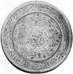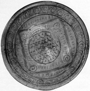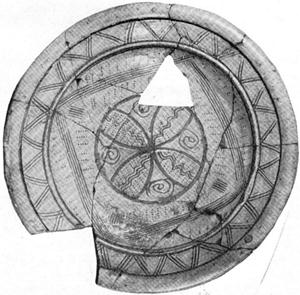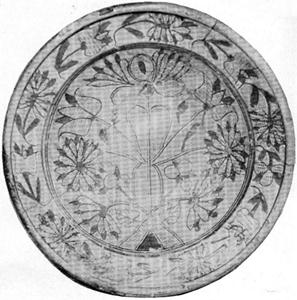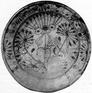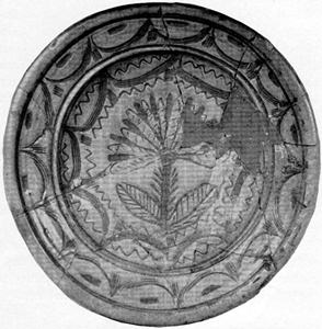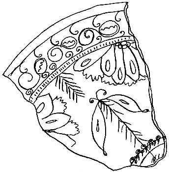 Figure 2.—Sketch of sherd of sgraffito-ware dish, dating about 1670, that was found during excavations of C. H. Brannam’s pottery in Barnstaple. (Sketch by Mrs. Constance Christian, from photo.)