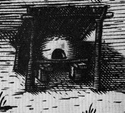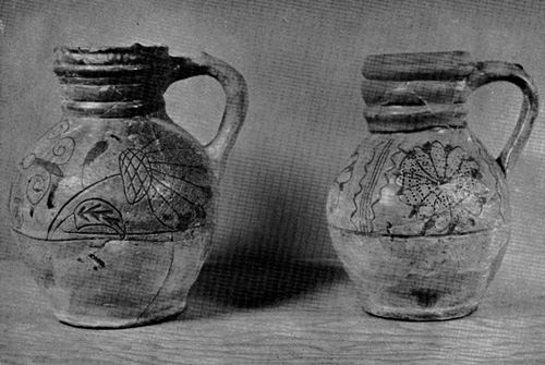 The sgraffito pottery is a red earthenware, coated with a white slip through which designs have been incised. An amber lead glaze imparts a golden yellow to the slip-covered portions and a brownish amber to the exposed red paste. The gravel-tempered ware is made of a similar red-burning clay and is remarkable for its lack of refinement, for the pebbly texture caused by protruding bits of gravel, and for the crude and careless manner in which the heavy amber glaze was applied to interior surfaces. Once seen, it is instantly recognizable and entirely distinct from other known types of English or continental pottery. A complete oven (fig. 10), now restored at[Pg 20] Jamestown, is of similar paste and quality of temper. It has a roughly oval beehive shape with a trapezoidal framed opening in which a pottery door fits snugly.