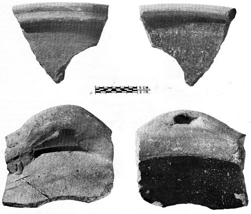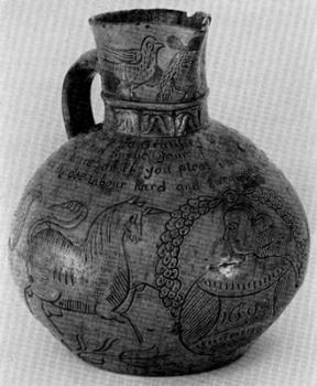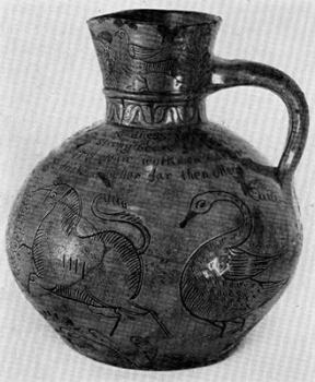 Satisfying instances of these uses were revealed with the discovery in 1935 of two distinct but unidentified pottery types in the excavations conducted by the National Park Service at Jamestown, Virginia, and later elsewhere along the eastern seaboard. One type was an elaborate and striking yellow sgraffito ware, the other a coarse utilitarian kitchen ware whose red paste was heavily tempered with a gross water-worn gravel or “grit.” Included in the latter class were the components of large earthen baking ovens. Among the literally hundreds of thousands of sherds uncovered at Jamestown between 1935 and 1956, these types occurred with relatively high incidence. For a long time no relationship between them was noted, yet their histories have proved to be of one fabric, reflecting the activities of a 17th-century English potterymaking center of unsuspected magnitude.