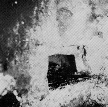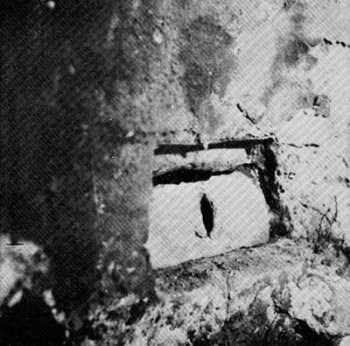 | Figure 8.—Views of opening of oven in figure 7, photographed before its removal from house. This illustrates how oven was built into corner of fireplace and concealed from view. At right, the oven door is in place. (Photos by A. C. Littlejohns.) | ||