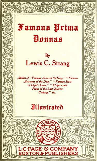 The Project Gutenberg EBook of Famous Prima Donnas, by Lewis Clinton Strang This eBook is for the use of anyone anywhere at no cost and with almost no restrictions whatsoever. You may copy it, give it away or re-use it under the terms of the Project Gutenberg License included with this eBook or online at www.gutenberg.org Title: Famous Prima Donnas Author: Lewis Clinton Strang Release Date: May 24, 2011 [EBook #36215] Language: English Character set encoding: ISO-8859-1 *** START OF THIS PROJECT GUTENBERG EBOOK FAMOUS PRIMA DONNAS *** Produced by Linda Cantoni, Bryan Ness, David E. Brown, and the Online Distributed Proofreading Team at https://www.pgdp.net (This file was produced from images generously made available by The Internet Archive/American Libraries.)