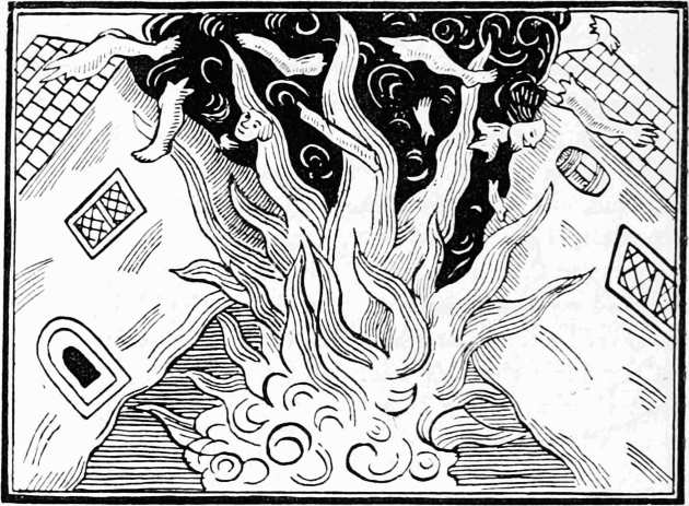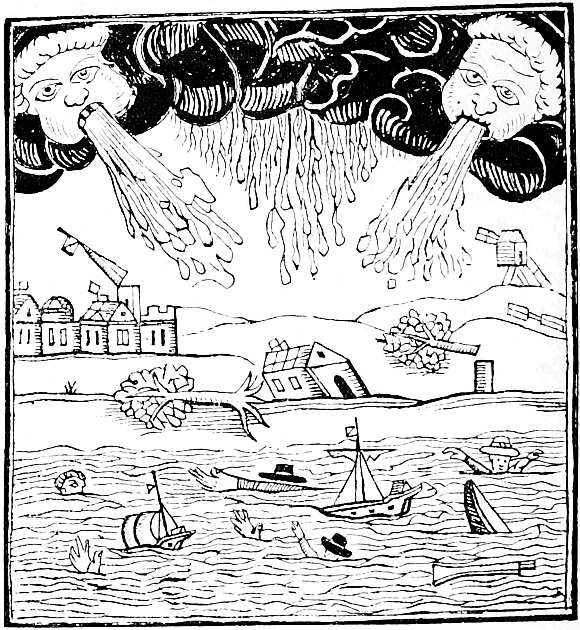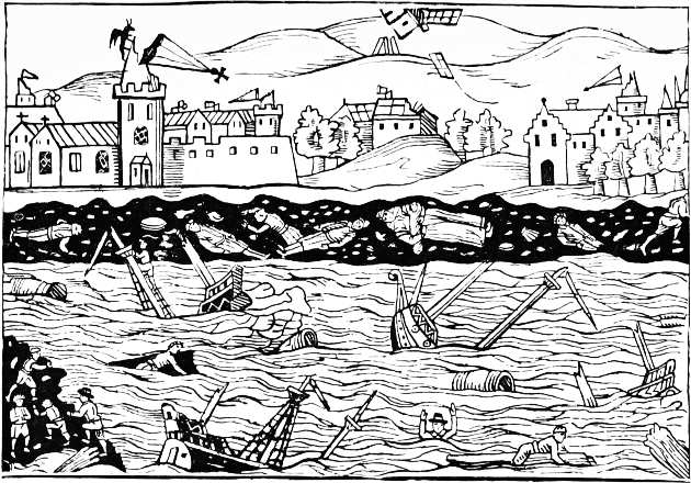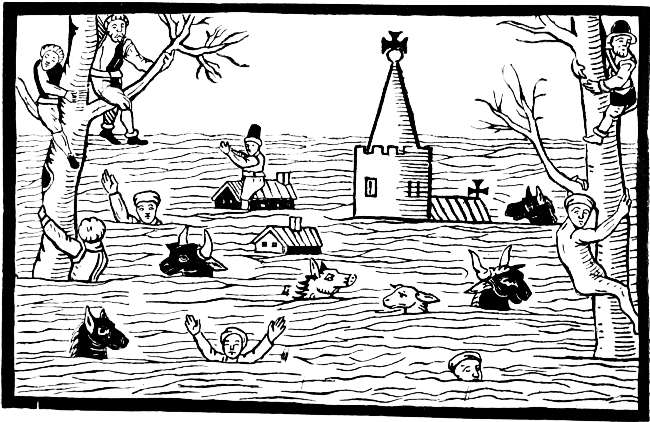 In the reign of James I. papers of news began to be published, but they only appeared occasionally, and were chiefly devoted to foreign intelligence. In 1619 we have ‘Newes out of Holland,’ followed by others in 1620, 1621, and 1622. These occasional tracts were afterwards converted into a regular weekly publication, entitled the ‘Weekly News,’ printed by J. D. for Nichs. Bourne and T. Archer. This was the first periodical newspaper published in England. But long before this many illustrated tracts and pamphlets were published relating to events of recent occurrence. In one dated 1607 occurs the earliest instance I have met with of an attempt to illustrate the news of the day. It is entitled ‘Wofull Newes from Wales, or the lamentable loss of divers Villages and Parishes (by a strange and wonderful Floud) within the Countye of Monmouth in Wales: which happened in January last past, 1607, whereby a great number of his Majesties subjects inhabiting in these parts are utterly undone.’ 13 The writer of this news-book describes the flood, and then, taking it for his text, preaches a sermon upon it. It is printed in Old English, and is plentifully interspersed with pious exhortations and scriptural references. It has on the title a woodcut, a fac-simile of which is given on the next page.