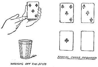 Now, if you hold up this card by the sides you can easily fold the loose half back a little when you are putting the glass on the edge of the card, and thus you get a firm standing place for the glass. If you wish to be able to throw this card down on the table without giving away the secret (because there will naturally be a little curve in the part which you folded back) you must make a little spring hinge by means of a strip of india-rubber down the card. A card prepared in this way can be bought at a conjuring shop. The trick is quite a good one when done in this way, but, of course, it has this drawback. If you are performing at a friend's house and you are using borrowed cards it is more than probable that the backs of the borrowed cards will not match the back of the trick card. Well, you can do the trick without the use of a specially prepared card, and this brings us to the third method.