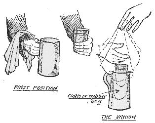 The little "twist" I have mentioned consists in using an eyeglass with a hole in it. The hole enables you to attach the eyeglass by a short piece of cotton to one corner of the handkerchief. The trick is doubly effective when done in this way because at the beginning you can show that you have only the penny in your hand. Arrange the handkerchief in your pocket before commencing the trick; you will find it convenient to have it either in your right trousers pocket or the left-hand inside pocket of your coat; then you will be able to get at it easily. The prepared corner, with the eyeglass resting on it, should be at the top. When you take the handkerchief by the prepared corner from your pocket the eyeglass will hang down behind the handkerchief and be hidden there. Then take the handkerchief by the prepared corner in your left hand and apparently place the penny under the handkerchief, but of course you conceal the penny in your hand and bring up the eyeglass. Someone grasps the eyeglass by the edge (through the handkerchief) and lets it fall into the tumbler. You then take the handkerchief by the prepared corner and pull it upwards quickly and then away from the glass. Put the handkerchief into your pocket as you pour the water out of the glass to show that the penny has vanished. The small boy may ask to see the handkerchief again, and so you have taken the precaution to have another handkerchief, bunched up in your pocket, in readiness. And this is the handkerchief that you produce for inspection—if someone insists on seeing "the handkerchief" but not otherwise.