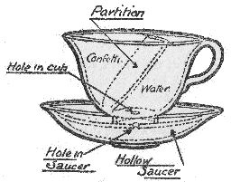 You can keep the game going for quite a little time if you can induce enough brave spirits to take a hand, but sooner or later someone is sure to suggest that you try the trick yourself. You at once consent, and you tell your audience that if they will cut the string you will most certainly catch the mug directly it falls. While making this apparently rash promise you quietly tie a little loop in the string and keep it hidden with your hand for a moment. When your assistant is holding one end of the string and everyone is prepared to see you get a ducking you take your hand away from the loop, tell your assistant to cut the string "just there" pointing to the loop, and you will catch the mug directly it falls; of course, it will not fall.