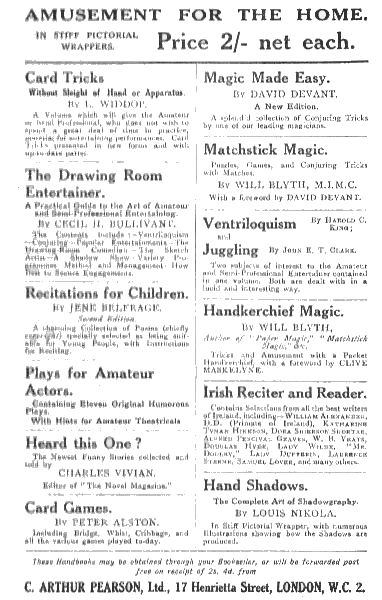 | Topsy Turvy—A Sporting Offer—A Feat of Dexterity—More than Full—The Obedient Corks—A Peculiar Egg—The Suspended Mug—The Sticky Glass—The Floating Pin—Washing a Card | ||