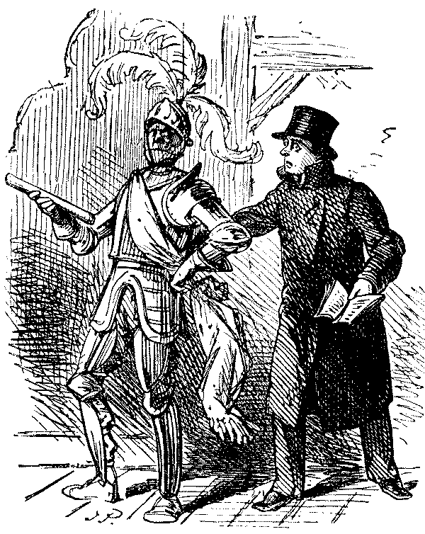 Indignant Playwright (to leading actor, behind the scenes). "Confound it, man, you've absolutely murdered the piece!" Leading Actor. "Pardon me, but I think the foul play is yours!"