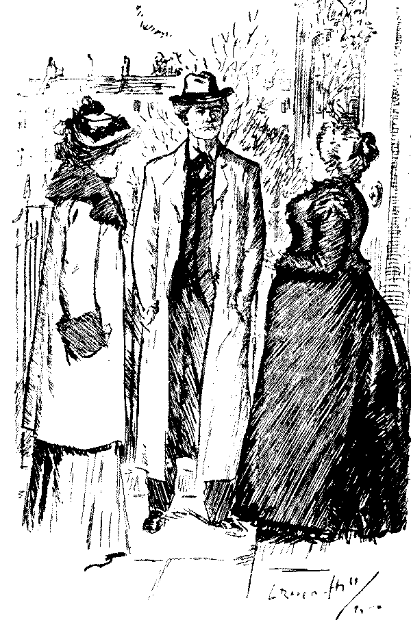 "The other night, at the Novelty Theatre, Mrs. Vere-Jones was gowned simply in a clinging black velvet, with a cloak of same handsomely trimmed with ermine."—Extract from Society Journal.