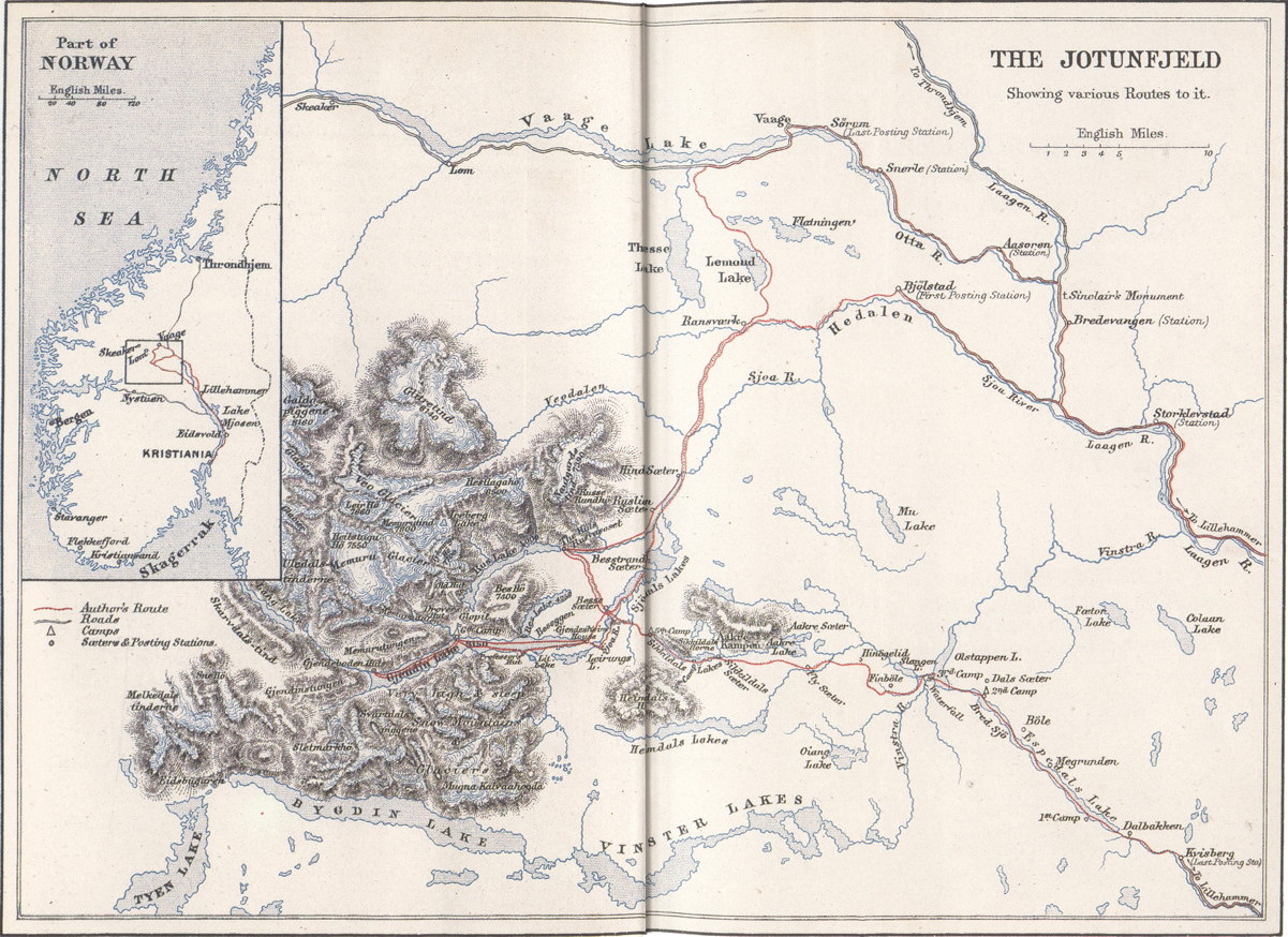 We were engaged till late at night putting the finishing touches to our packing. The last thing we did was to put our most gorgeous apparel, and any articles not likely to be needed during our camp life, into two portmanteaus, with strict orders to the Boots to keep the same until our return. This morning, after an early breakfast, on descending to the courtyard we found these portmanteaus roped down on the roof of the omnibus which was to take all the luggage to the station en route for Lillehammer. This we rectified, and then set off to walk to the station ourselves.
