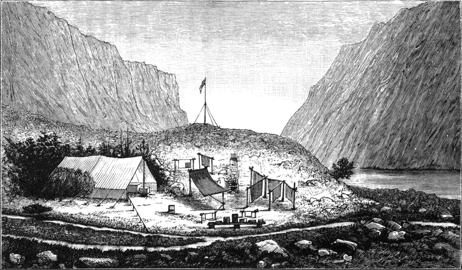 Any natives who see our camp when rowing past come to shore to inspect us and our belongings. They all adopt the same course of procedure. They land, and stare, and say nothing; then they pull up their boat and make it safe, and advancing close 33 to the tent stare, and say nothing either to each other or us. Then Esau says confidentially, as if it was a new and brilliant idea (he has done exactly the same thing some scores of times), ‘We’d better be civil to these fellows; perhaps they could bring us some eggs, and they look pretty friendly.’ The natives are all the time staring and saying nothing. Then Esau remarks in Norwegian, ‘It is fine weather to-day; have you any eggs?’ To this the chief native replies at great length in his own barbarous jargon, and Esau not having understood a single syllable answers, ‘Ja! ja! (yes), but have you any eggs?’ Then aside to the Skipper, ‘Wonder what the deuce the fool was talking about?’ Soon the natives perceive that their words are wasted, and relapse into the silent staring condition again, and after a time and a half, or two times, they depart as they came. Sometimes they return again with eggs in a basket, when we pay them well and give them some fish; at other times they look upon us as dangerous lunatics, and avoid us like the plague.