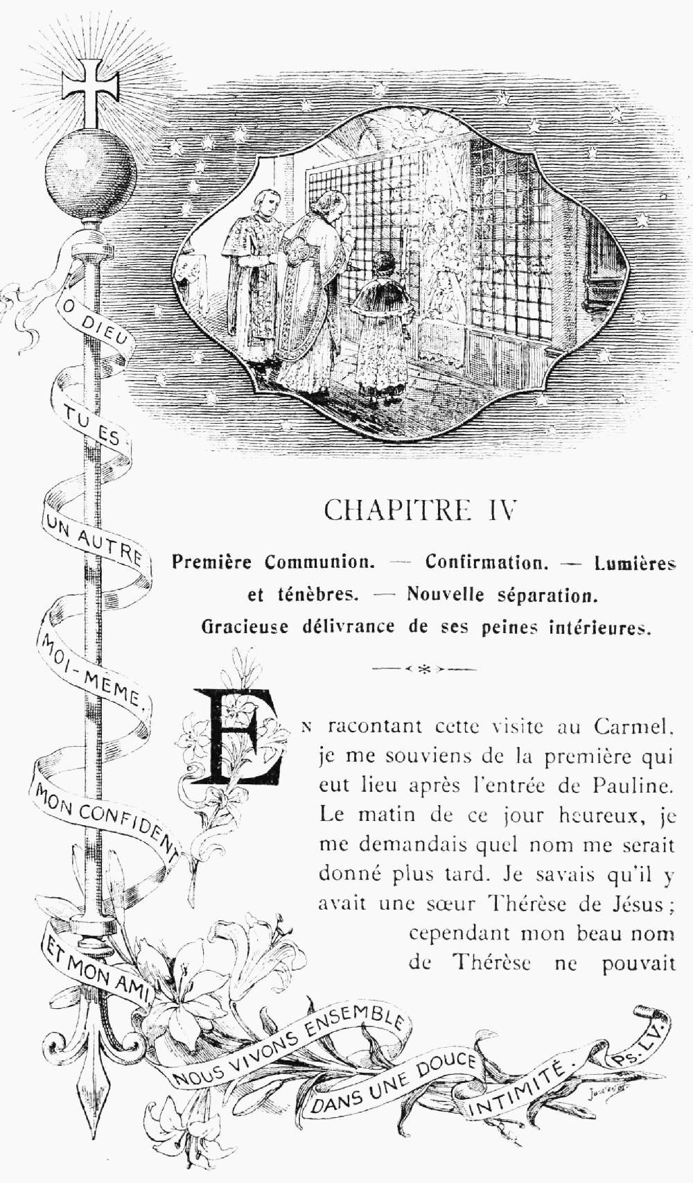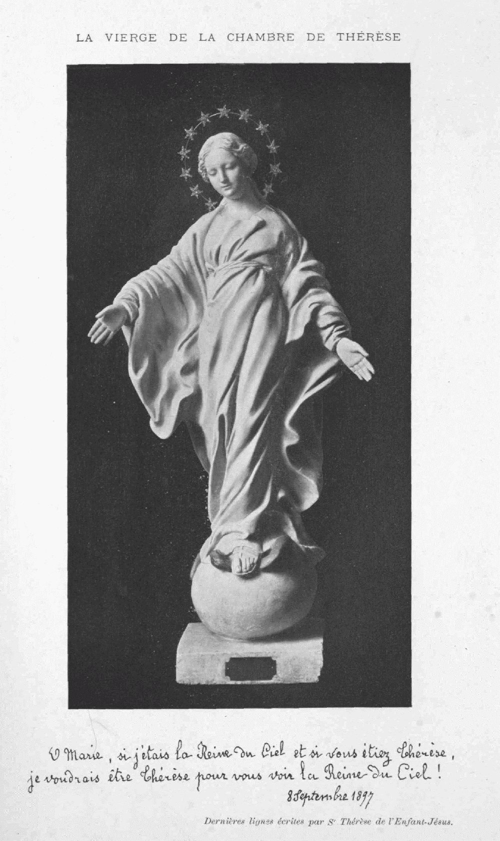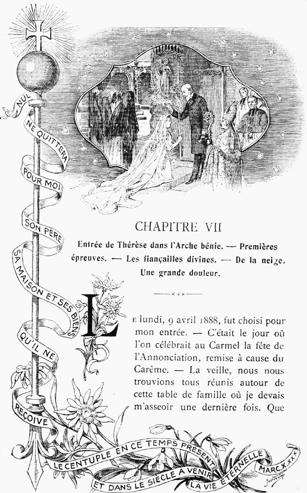 J'approuve votre dessein de faire une nouvelle édition de la Vie de Sœur Thérèse de l'Enfant-Jésus et de la Sainte Face. Vous savez comme moi combien de faits merveilleux semblent montrer que le bon Dieu veut mettre en lumière cette petite fleur du Carmel qui s'est épanouie dans votre cloître, puis a été cueillie vite pour être transplantée au Ciel.
