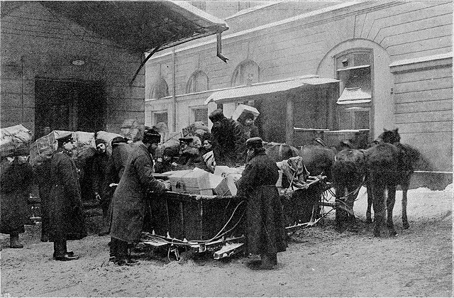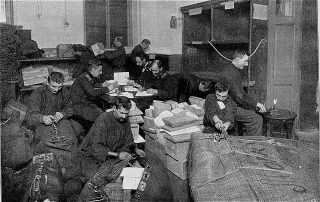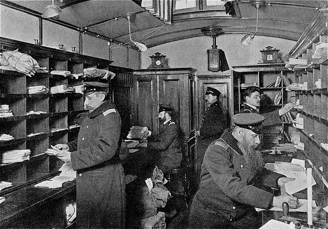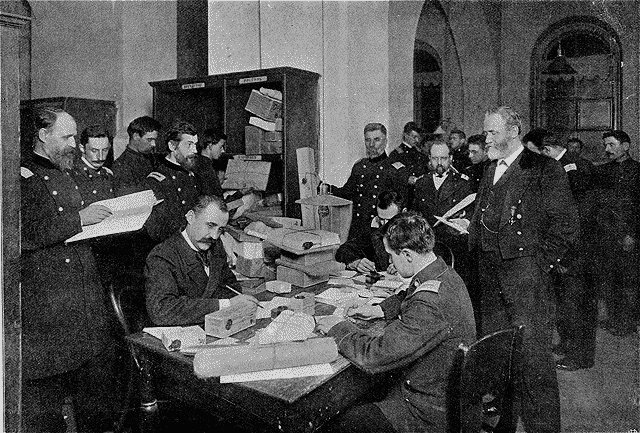 Intérieur d'un bureau de poste: le départ du courrier.