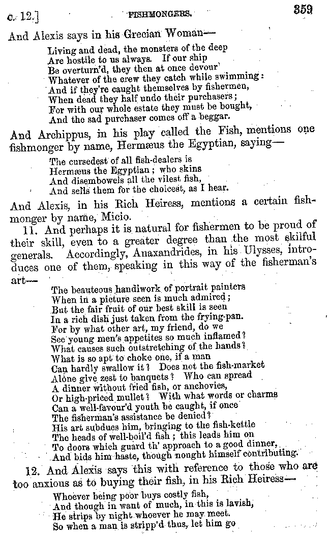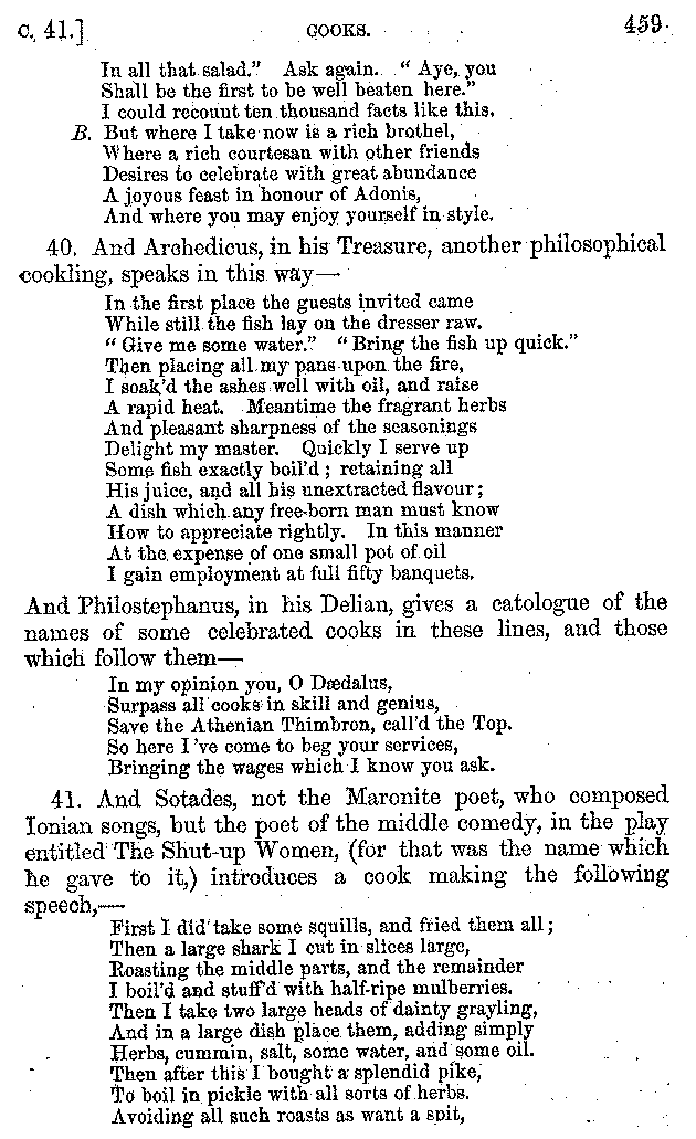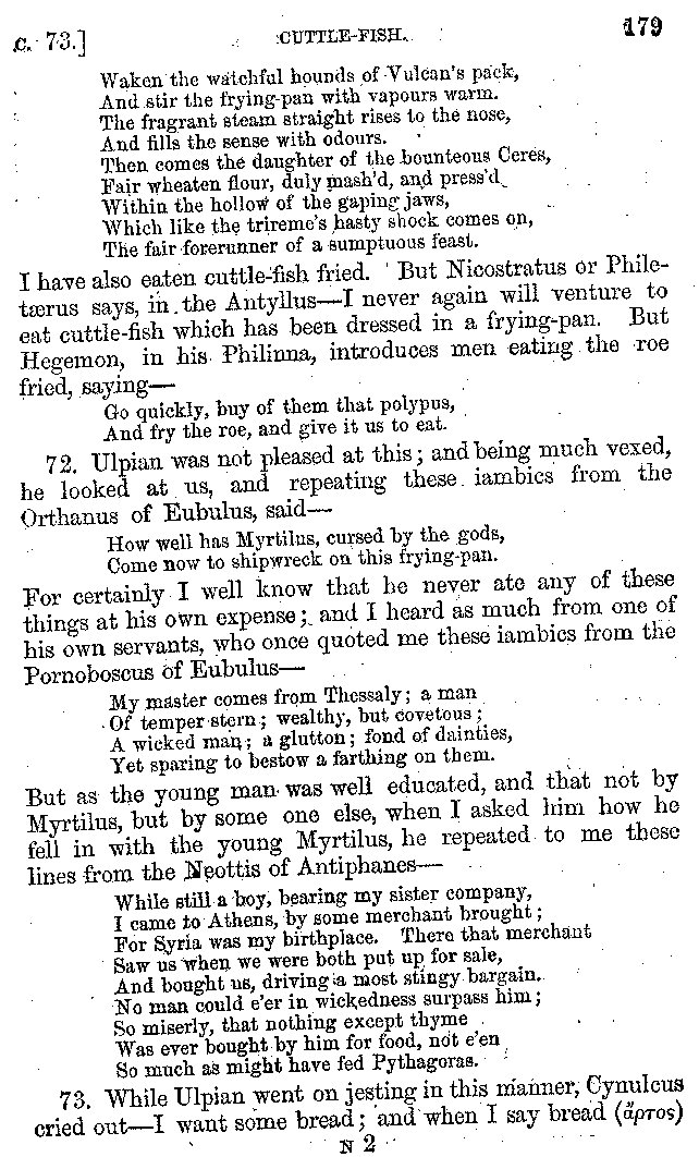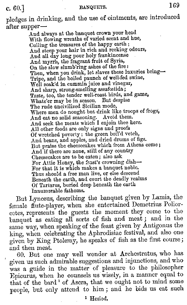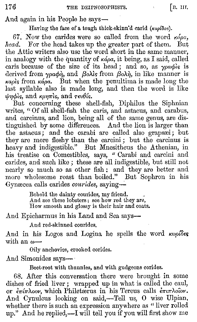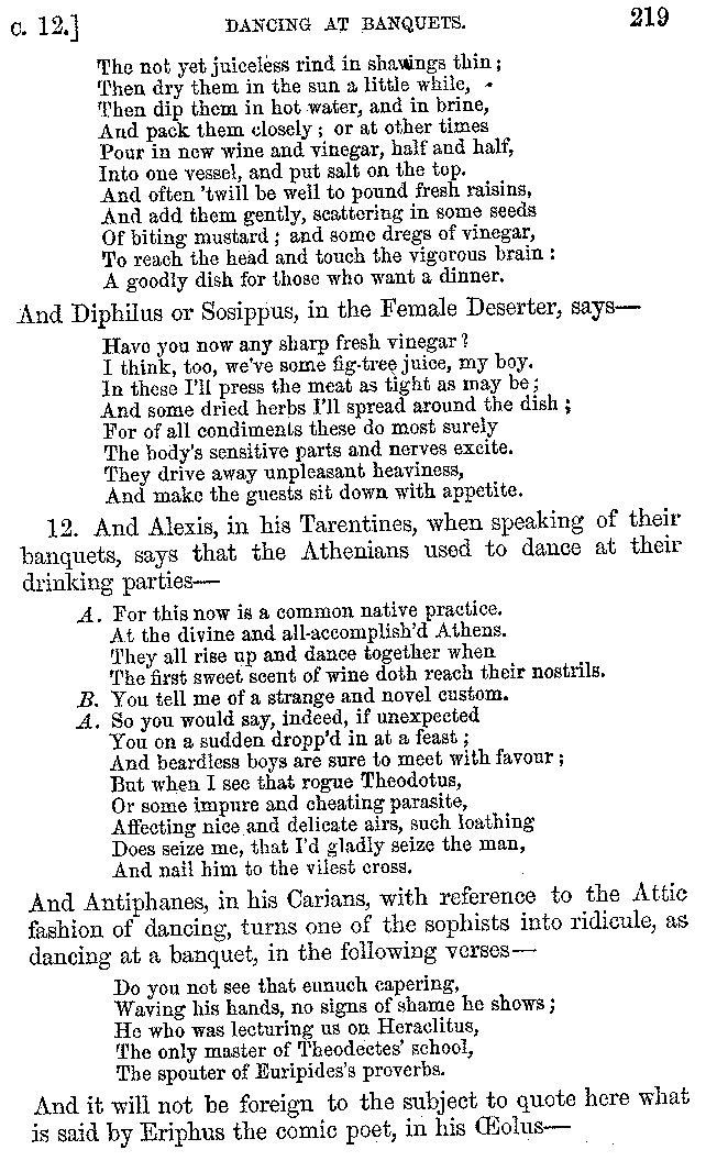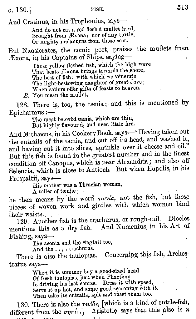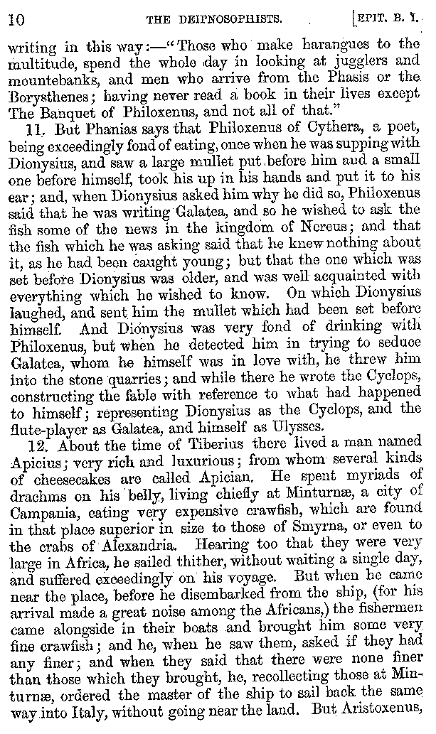 12. About the time of Tiberius there lived a man named Apicius; very rich and luxurious; from whom several kinds of cheesecakes are called Apician. He spent myriads of drachms on his belly, living chiefly at Minturnæ, a city of Campania, eating very expensive crawfish, which are found in that place superior in size to those of Smyrna, or even to the crabs of Alexandria. Hearing too that they were very large in Africa, he sailed thither, without waiting a single day, and suffered exceedingly on his voyage. But when he came near the place, before he disembarked from the ship, (for his arrival made a great noise among the Africans,) the fishermen came alongside in their boats and brought him some very fine crawfish; and he, when he saw them, asked if they had any finer; and when they said that there were none finer than those which they brought, he, recollecting those at Minturnæ, ordered the master of the ship to sail back the same way into Italy, without going near the land. But Aristoxenus, [11]the philosopher of Cyrene, a real devotee of the philosophy of his country, (from whom, hams cured in a particular way are called Aristoxeni,) out of his prodigious luxury used to syringe the lettuces which grew in his garden with mead in the evening, and then, when he picked them in the morning, he would say that he was eating green cheesecakes, which were sent up to him by the Earth.