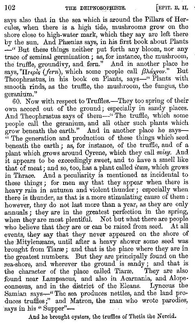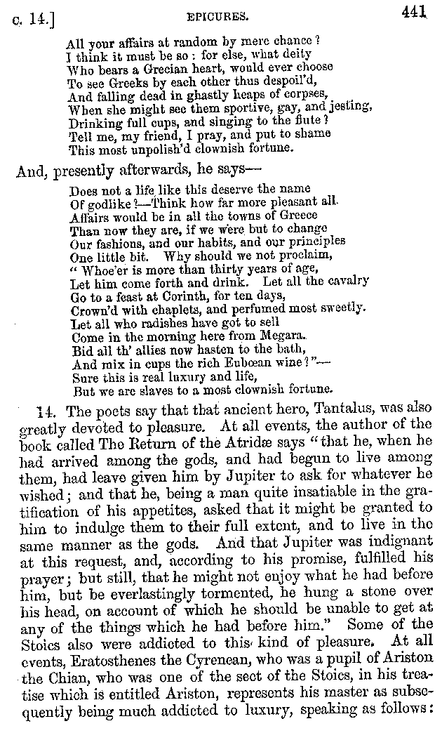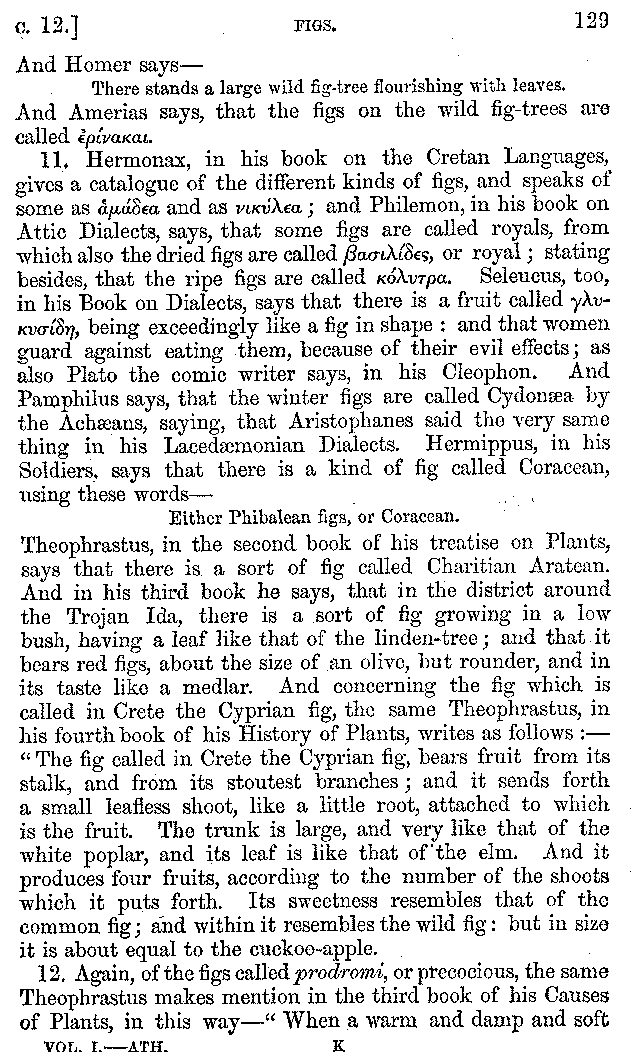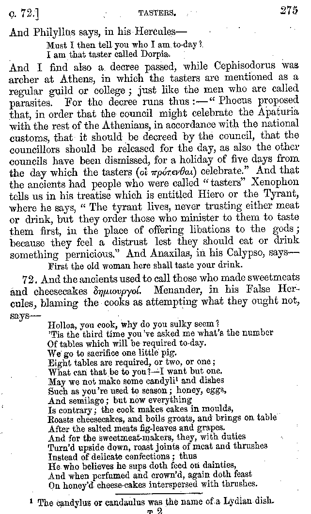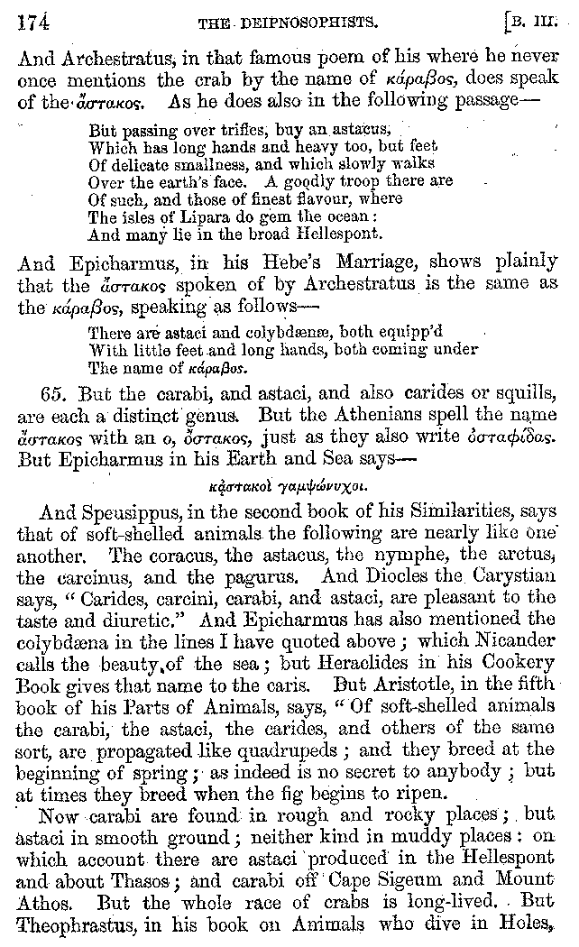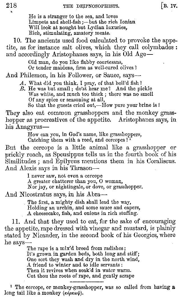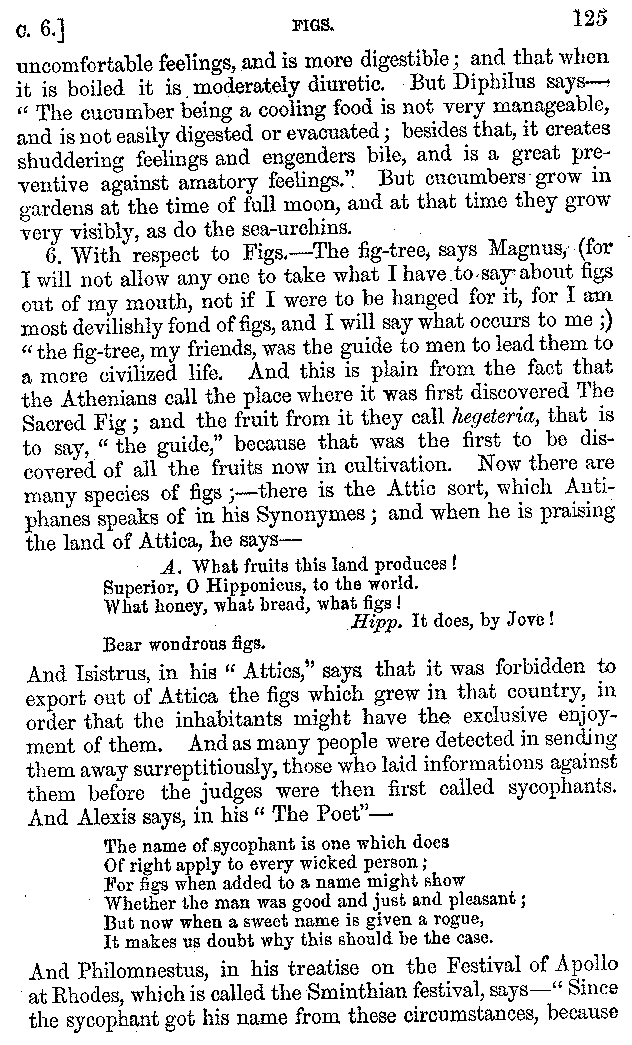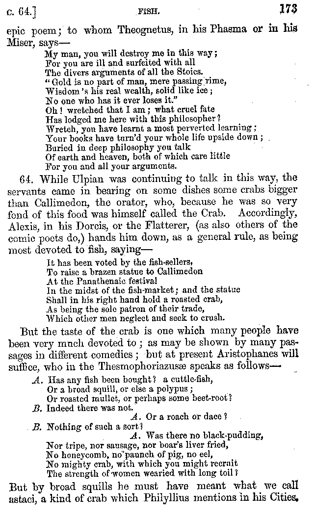 12. About the time of Tiberius there lived a man named Apicius; very rich and luxurious; from whom several kinds of cheesecakes are called Apician. He spent myriads of drachms on his belly, living chiefly at Minturnæ, a city of Campania, eating very expensive crawfish, which are found in that place superior in size to those of Smyrna, or even to the crabs of Alexandria. Hearing too that they were very large in Africa, he sailed thither, without waiting a single day, and suffered exceedingly on his voyage. But when he came near the place, before he disembarked from the ship, (for his arrival made a great noise among the Africans,) the fishermen came alongside in their boats and brought him some very fine crawfish; and he, when he saw them, asked if they had any finer; and when they said that there were none finer than those which they brought, he, recollecting those at Minturnæ, ordered the master of the ship to sail back the same way into Italy, without going near the land. But Aristoxenus, [11]the philosopher of Cyrene, a real devotee of the philosophy of his country, (from whom, hams cured in a particular way are called Aristoxeni,) out of his prodigious luxury used to syringe the lettuces which grew in his garden with mead in the evening, and then, when he picked them in the morning, he would say that he was eating green cheesecakes, which were sent up to him by the Earth.