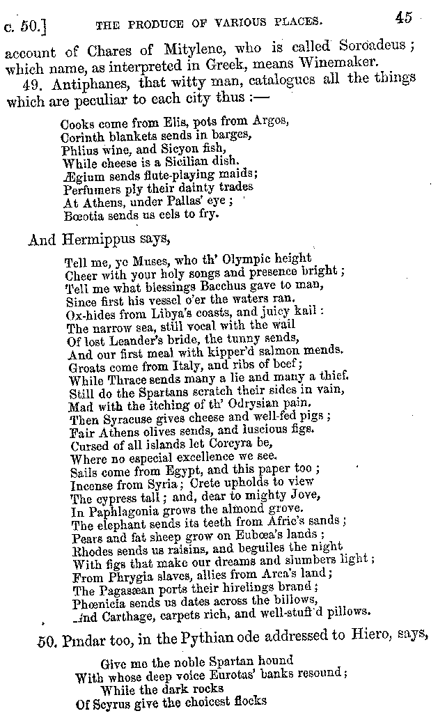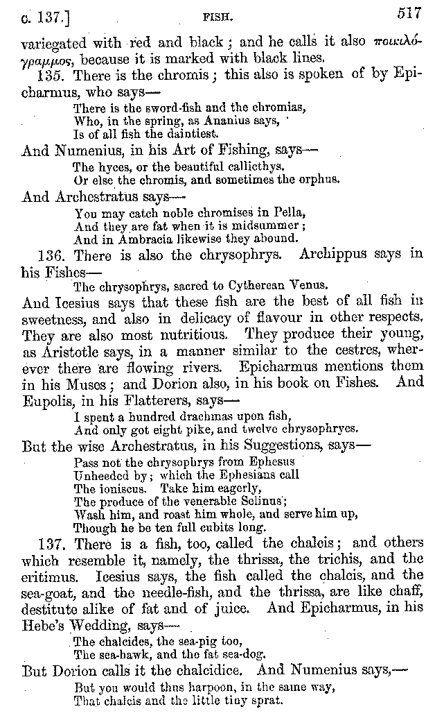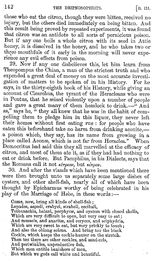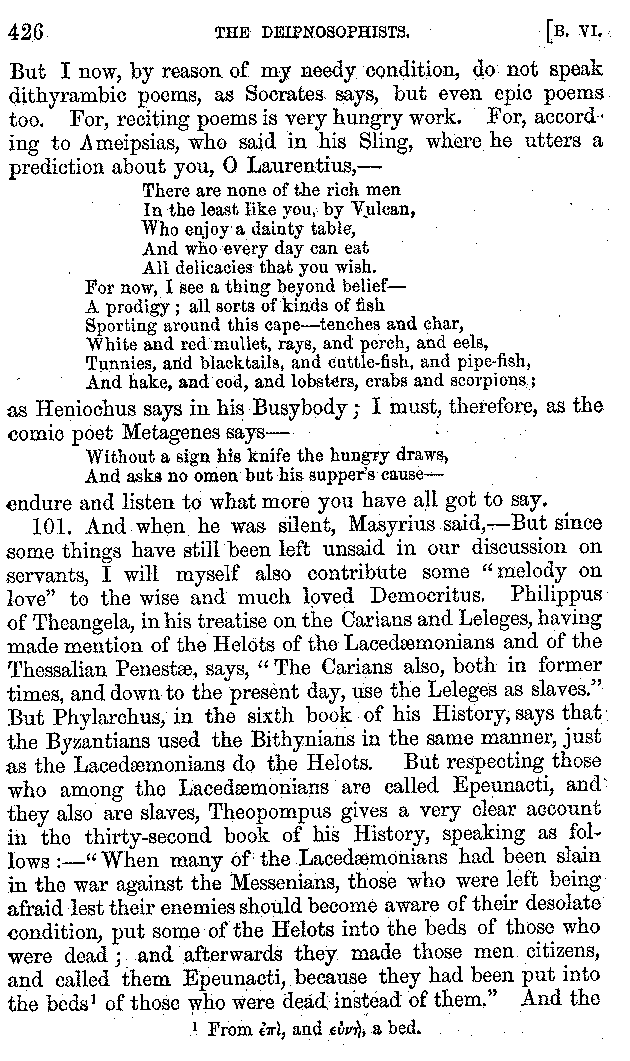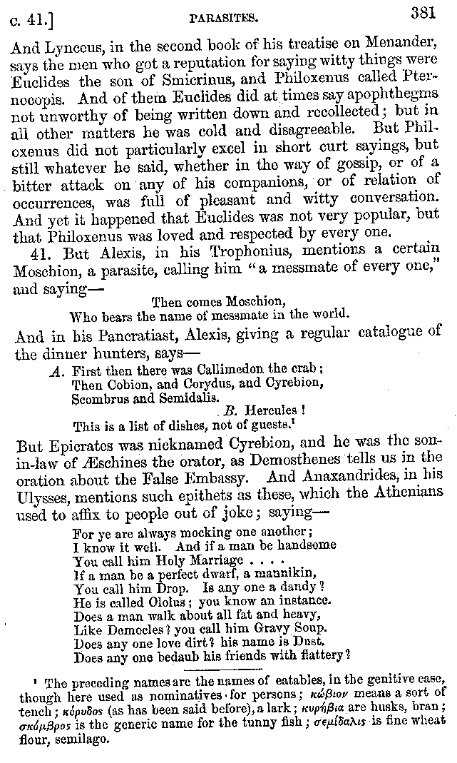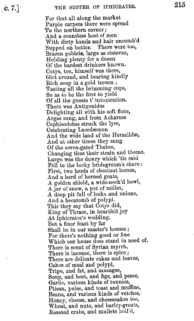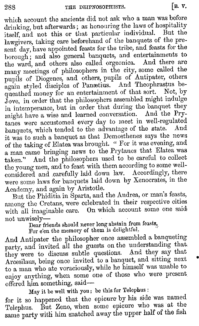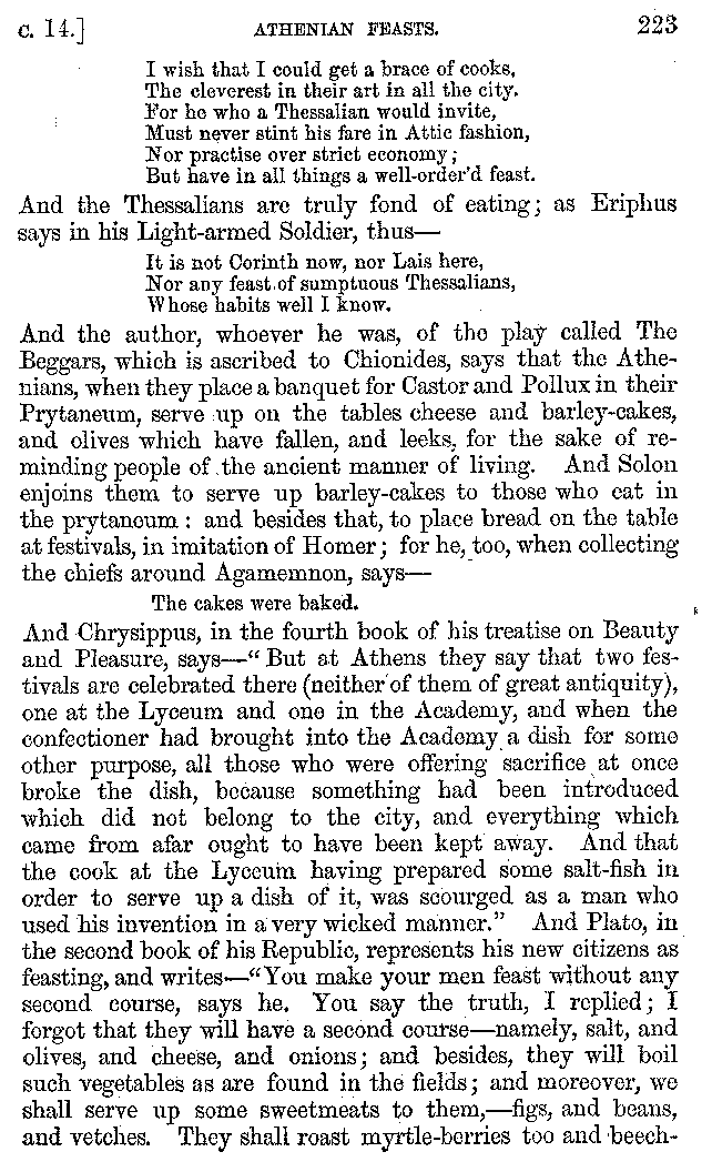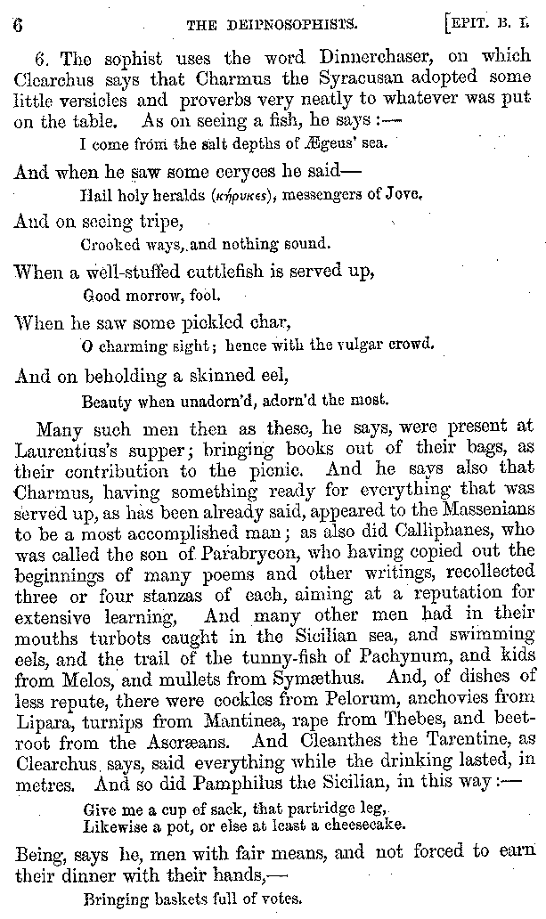 Many such men then as these, he says, were present at Laurentius's supper; bringing books out of their bags, as their contribution to the picnic. And he says also that Charmus, having something ready for everything that was served up, as has been already said, appeared to the Massenians to be a most accomplished man; as also did Calliphanes, who was called the son of Parabrycon, who having copied out the beginnings of many poems and other writings, recollected three or four stanzas of each, aiming at a reputation for extensive learning. And many other men had in their mouths turbots caught in the Sicilian sea, and swimming eels, and the trail of the tunny-fish of Pachynum, and kids from Melos, and mullets from Symæthus. And, of dishes of less repute, there were cockles from Pelorum, anchovies from Lipara, turnips from Mantinea, rape from Thebes, and beet-root from the Ascræans. And Cleanthes the Tarentine, as Clearchus says, said everything while the drinking lasted, in metres. And so did Pamphilus the Sicilian, in this way:—