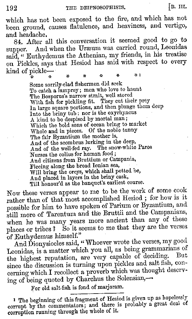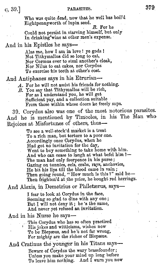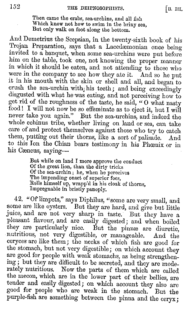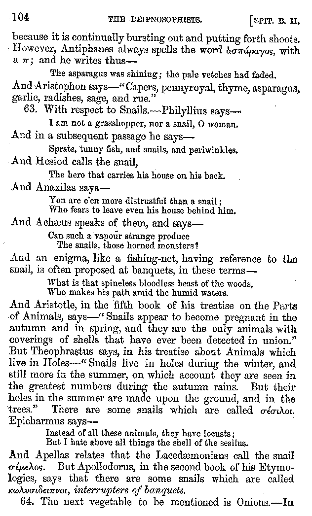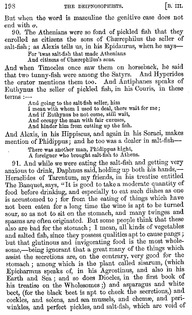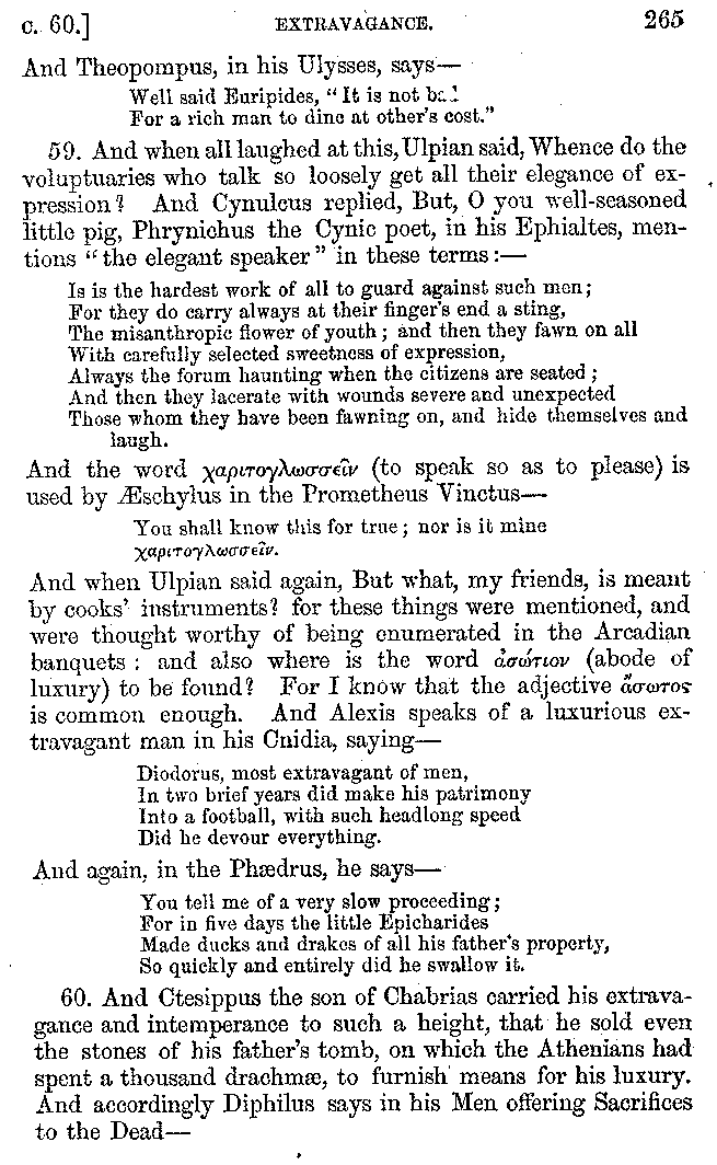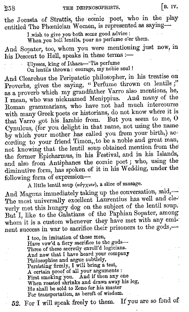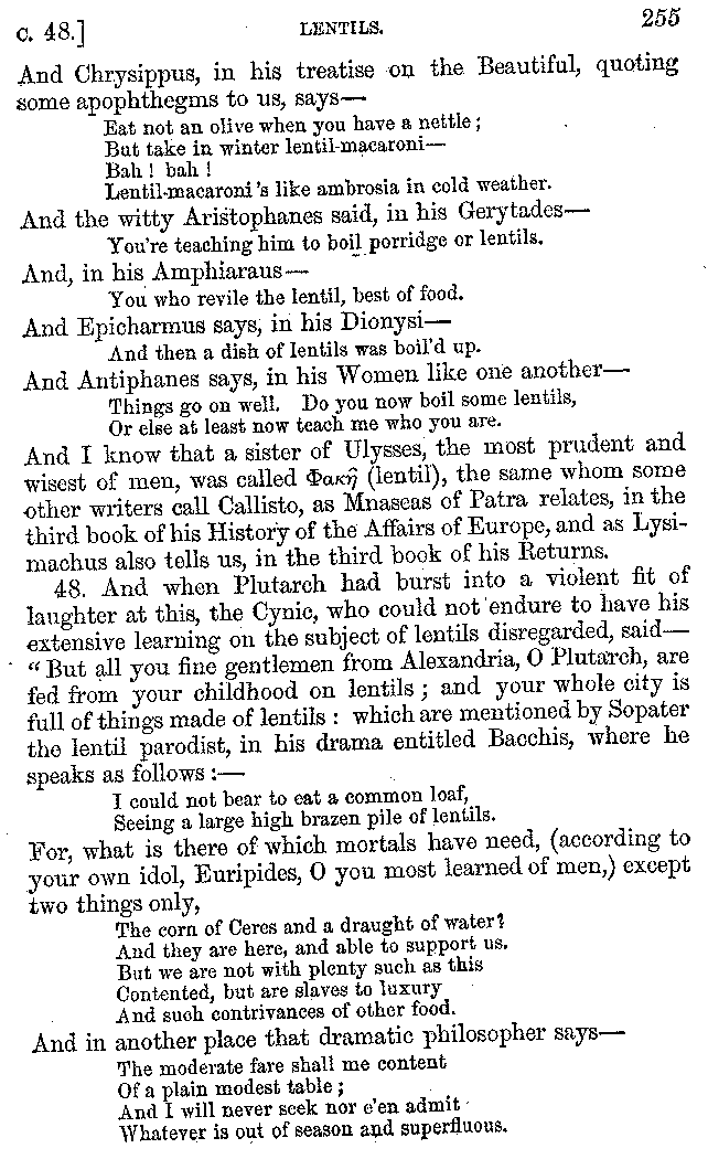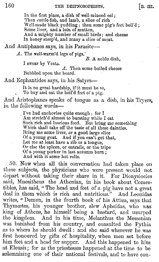 Many such men then as these, he says, were present at Laurentius's supper; bringing books out of their bags, as their contribution to the picnic. And he says also that Charmus, having something ready for everything that was served up, as has been already said, appeared to the Massenians to be a most accomplished man; as also did Calliphanes, who was called the son of Parabrycon, who having copied out the beginnings of many poems and other writings, recollected three or four stanzas of each, aiming at a reputation for extensive learning. And many other men had in their mouths turbots caught in the Sicilian sea, and swimming eels, and the trail of the tunny-fish of Pachynum, and kids from Melos, and mullets from Symæthus. And, of dishes of less repute, there were cockles from Pelorum, anchovies from Lipara, turnips from Mantinea, rape from Thebes, and beet-root from the Ascræans. And Cleanthes the Tarentine, as Clearchus says, said everything while the drinking lasted, in metres. And so did Pamphilus the Sicilian, in this way:—