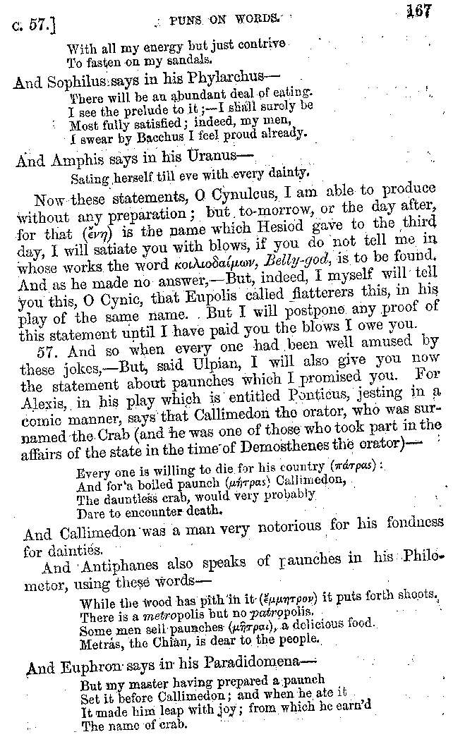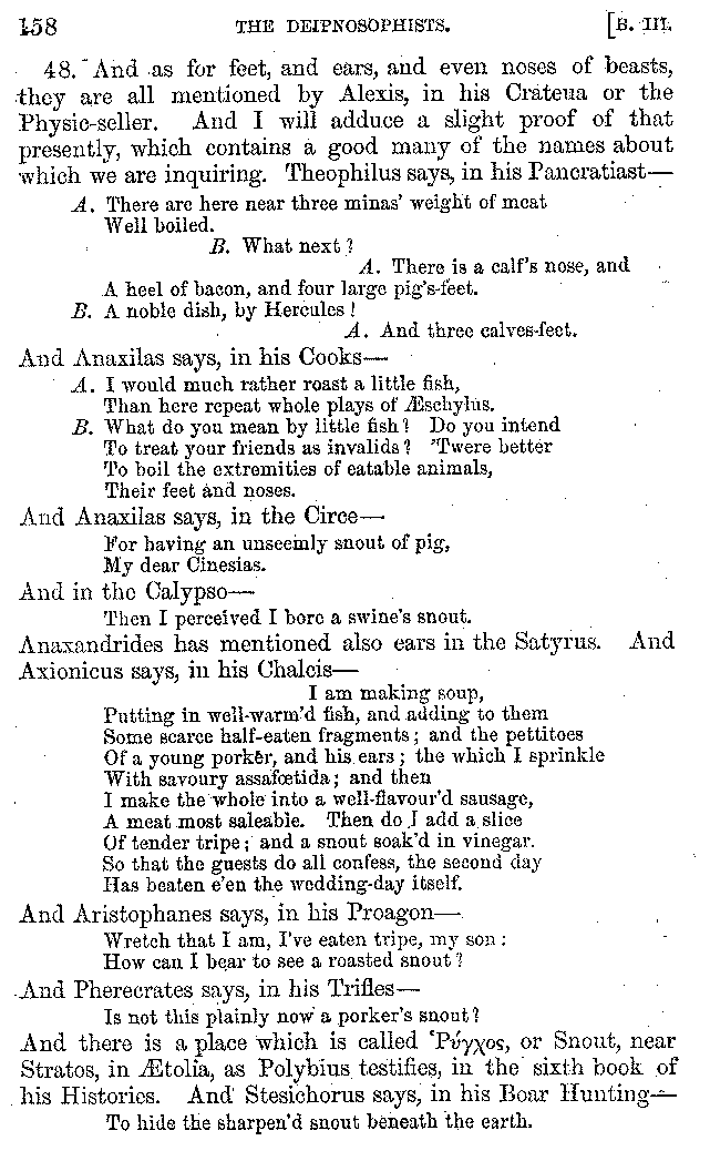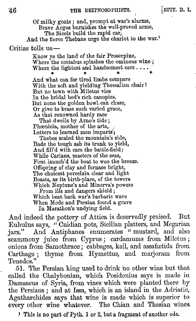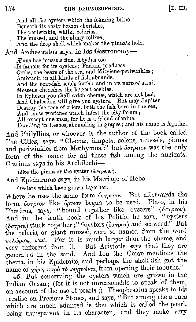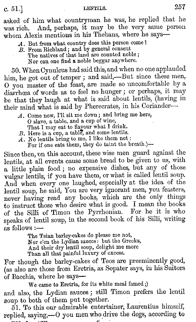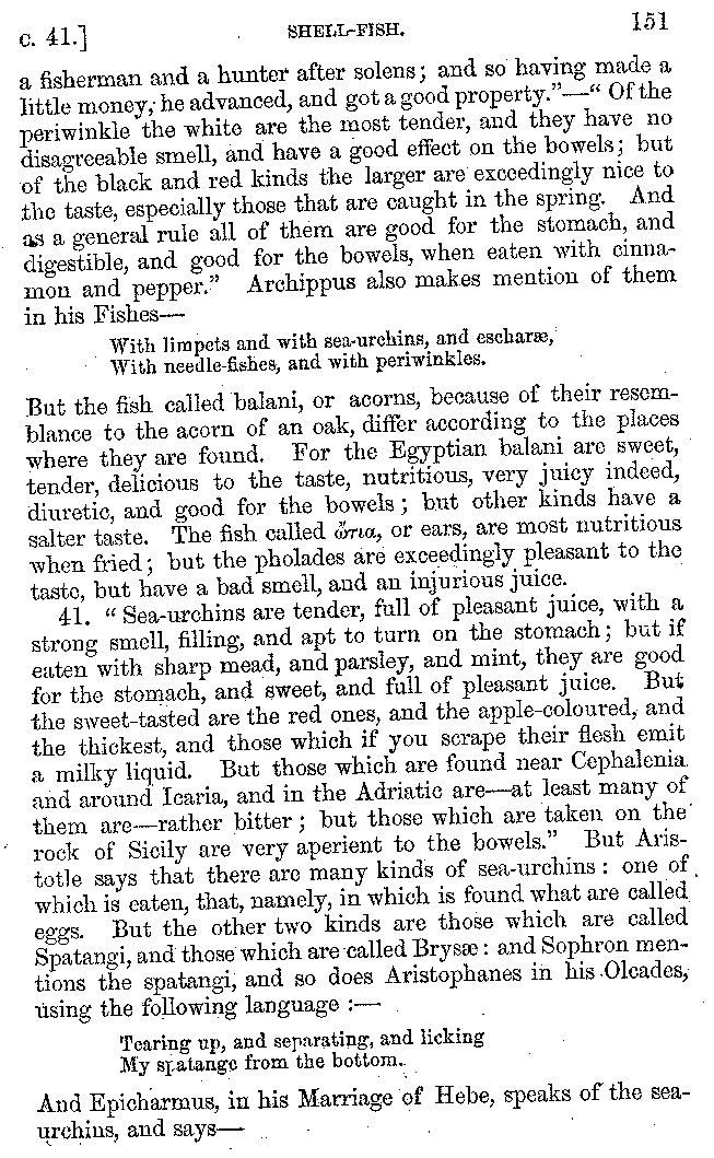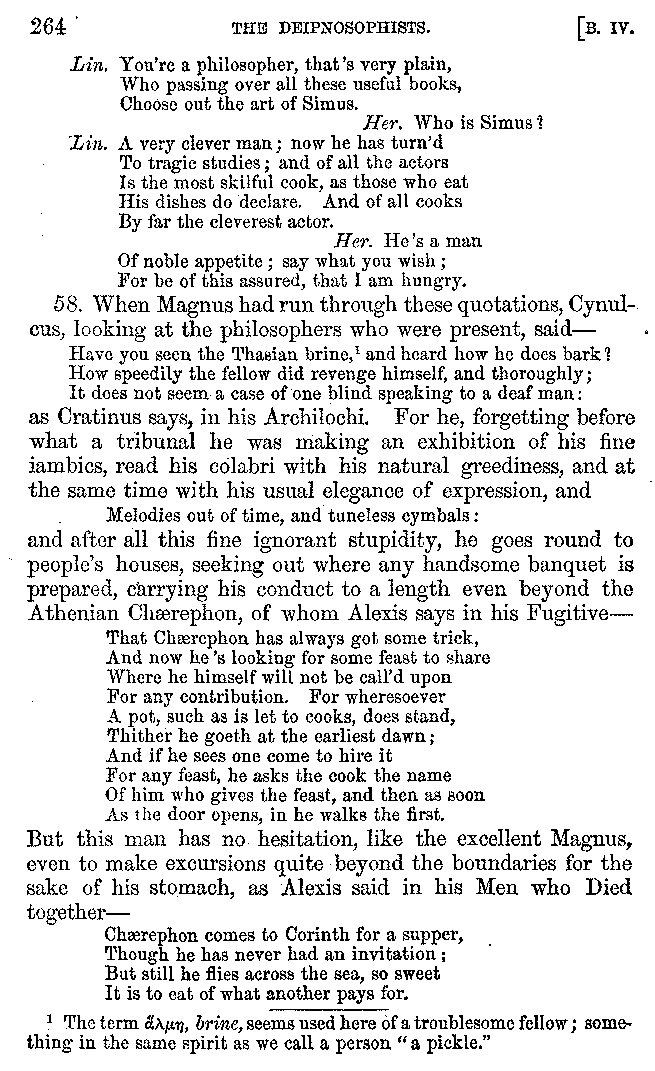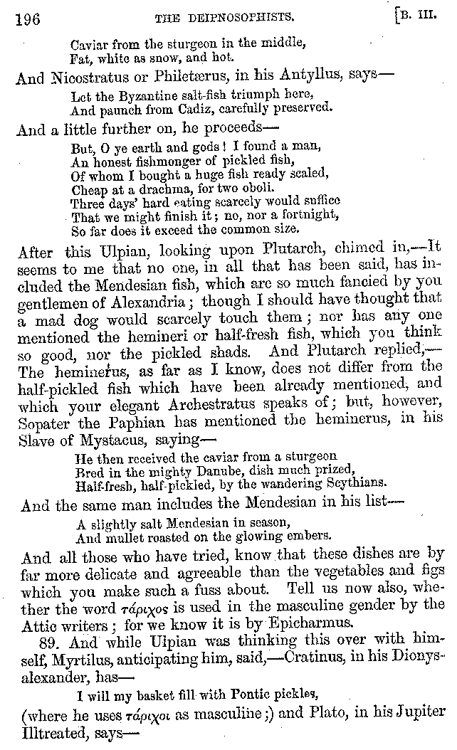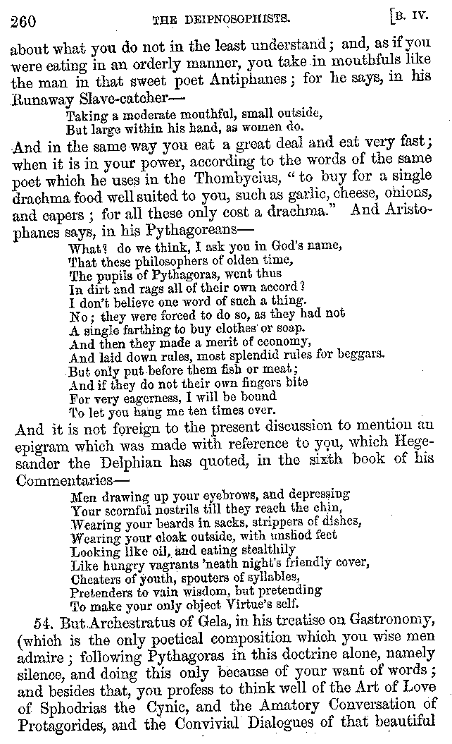 Many such men then as these, he says, were present at Laurentius's supper; bringing books out of their bags, as their contribution to the picnic. And he says also that Charmus, having something ready for everything that was served up, as has been already said, appeared to the Massenians to be a most accomplished man; as also did Calliphanes, who was called the son of Parabrycon, who having copied out the beginnings of many poems and other writings, recollected three or four stanzas of each, aiming at a reputation for extensive learning. And many other men had in their mouths turbots caught in the Sicilian sea, and swimming eels, and the trail of the tunny-fish of Pachynum, and kids from Melos, and mullets from Symæthus. And, of dishes of less repute, there were cockles from Pelorum, anchovies from Lipara, turnips from Mantinea, rape from Thebes, and beet-root from the Ascræans. And Cleanthes the Tarentine, as Clearchus says, said everything while the drinking lasted, in metres. And so did Pamphilus the Sicilian, in this way:—